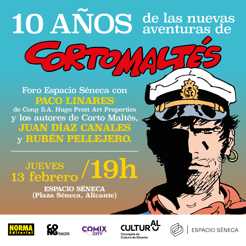 El primer Foro Espacio Séneca que se celebra este 2025 está dedicado a los “10 años de las nuevas aventuras de Corto Maltés” y se celebra este jueves día 13 a partir de las 19 horas. Los asistentes podrán conocer de primera mano la historia y curiosidades de la “segunda vida” de este icónico cómic de la mano de sus autores, Juan Díaz Canales y Rubén Pellejero, que conversarán junto con la responsable del legado de su autor original Hugo Pratt con el gestor cultural Paco Linares.