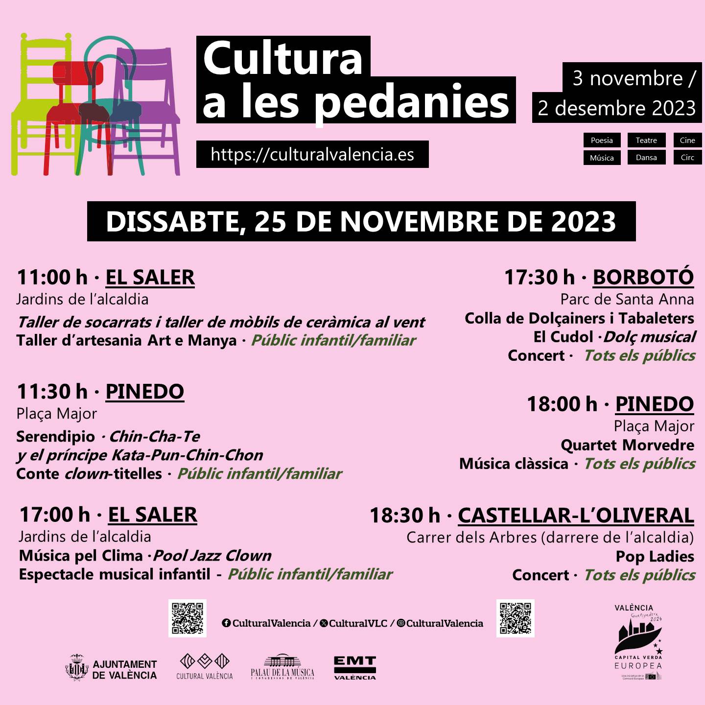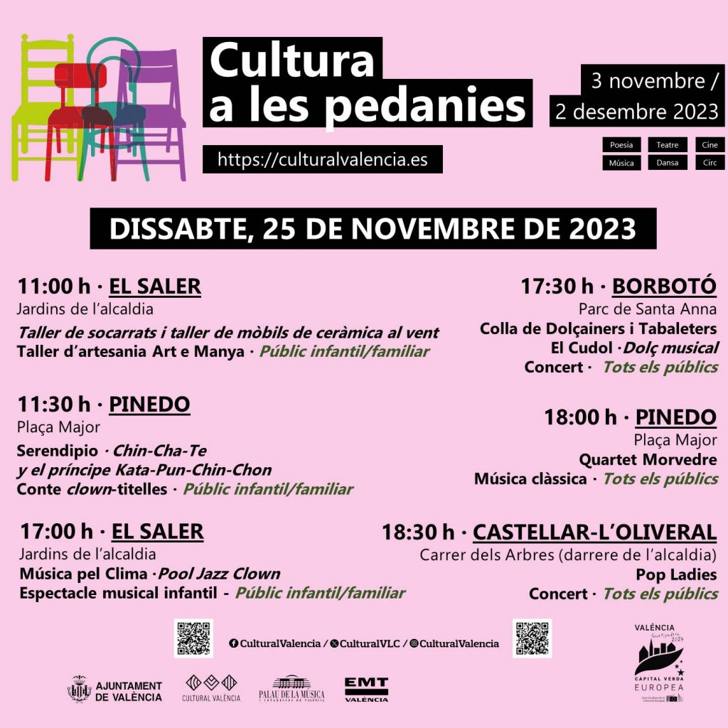 Por la tarde, los mencionados jardines de El Saler volverán a ser epicentro de la cultura. A las 17.00 horas albergarán un espectáculo combinado de música, clown y artes plásticas dirigido al público infantil: “Música pel Clima. Pool Jazz Clown”. Media hora más tarde, comenzará el concierto Dolç musical, un espectáculo de música y proyección audiovisual de bandas sonoras de películas de cine a cargo de la Colla de Dolçainers i Tabaleters El Cudol, en el parque de Santa Anna de Borbotó. A las 18 horas el Quartet Morvedre actuará en la plaza Major de Pinedo; y a las 18.30 horas, Pop Ladies en la calle dels Arbres de Castellar-L’Oliveral.