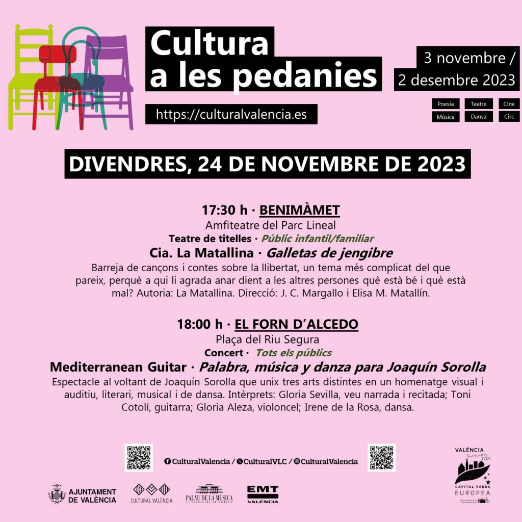 El anfiteatro del Parc Lineal de Benimàmet será el primer escenario de las actuaciones de ‘Cultura a les Pedanies’ programadas este fin de semana. El viernes 24, a las 17.30 horas, la compañía La Matallina interpretará “Galletas de Jengibre”, con una mezcla de canciones y cuentos sobre la libertad destinada al público familiar. Esa misma tarde, a las 18.00 horas en la plaza del Riu Segura de Forn d’Alcedo, se celebrará un concierto homenaje a Joaquín Sorolla que combinará manifestaciones artísticas. Gloria Sevilla, recitará unos textos acompañada del guitarrista Toni Cotolí, la violinista Gloria Aleza y la danza de Irene de la Rosa.