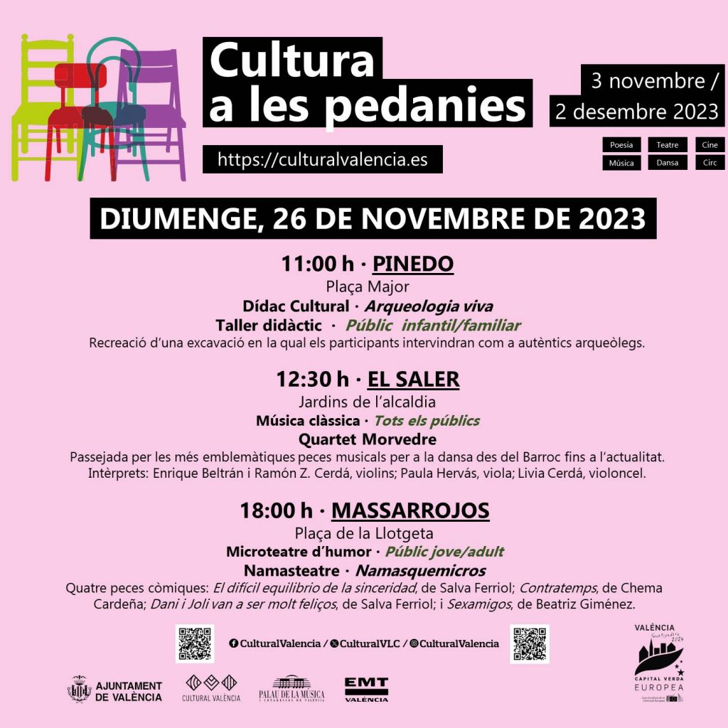 La primera cita cultural de proximidad del domingo será en la plaza Major de Pinedo. A las 11 horas, se impartirá un taller de arqueología didáctico y cultural para público familiar. Seguidamente, a las 12.30 horas, El Saler acogerá, en los Jardines de la Alcaldía, otra actuación de Quarter Morvedre que realizarà un paseo por emblemáticas piezas musicales creadas para la danza desde el Barroco hasta la actualidad.