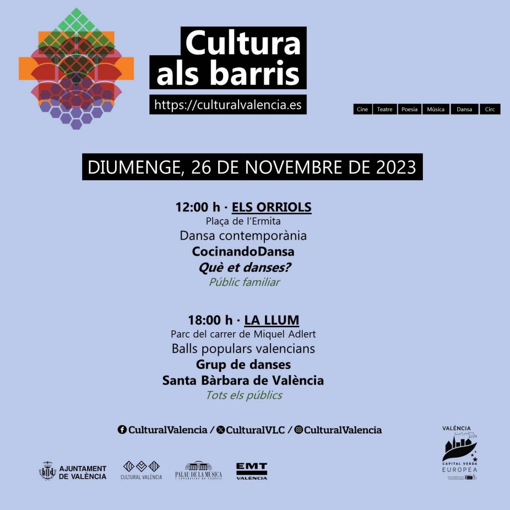 Por último, la jornada cultural del domingo, que se clausurará con el citado concierto en el barrio de la Llum, comenzará con un espectáculo de Danza contemporània en Els Orriols. A las 12 horas, en la plaza de la Ermita, toda la ciutadanía tiene una cita con la compañía Cocinando Dansa y su propuesta de danza participativa “Què et danses?”.