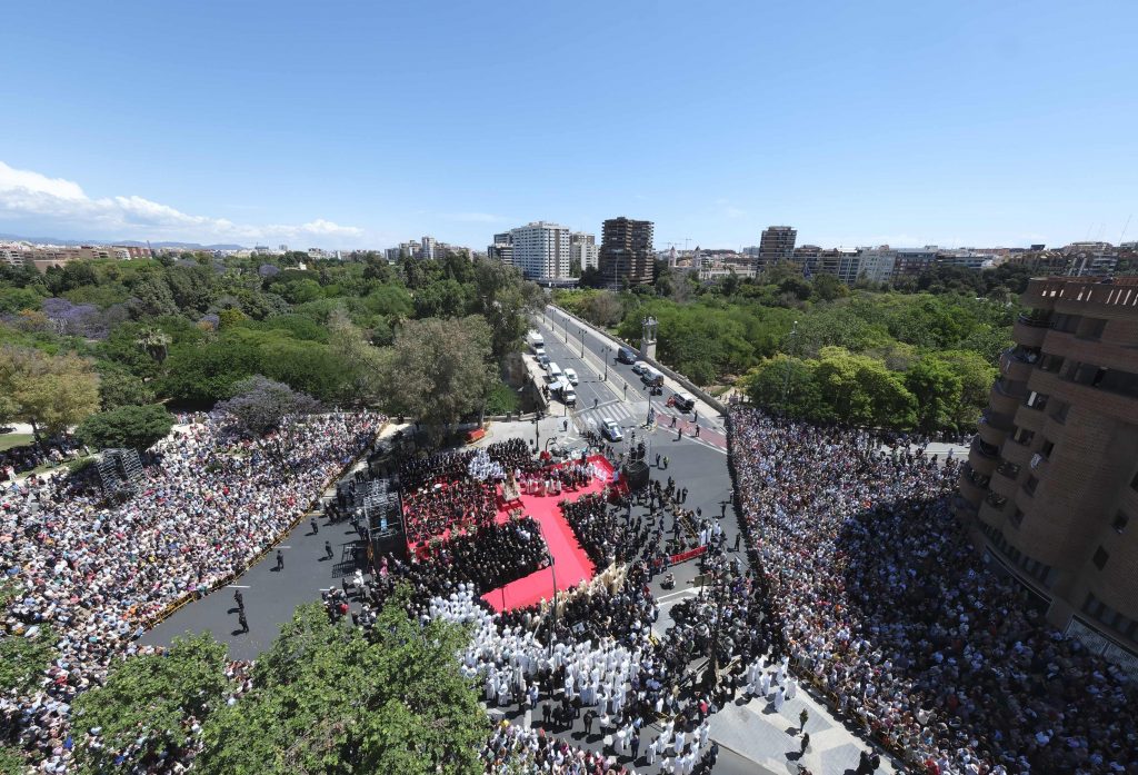 En el mismo lugar que en 1923, en el Puente del Real, hoy se ha culminado el homenaje a la Mare de Déu por el centenario de la Coronación canónica de la sagrada imagen de 1923. “A lo largo de estos cien años han cambiado muchas cosas en nuestra sociedad. Casi podríamos atrevernos a decir que nada es como antes y que seguramente nuestros antepasados no hubieran imaginado un mundo, una sociedad y una Iglesia como la de ahora. Pero con todo y eso, una cosa permanece casi inalterable: la Mare de Déu es un signo que sentimos presente en cada uno de nosotros y que nos une a todos. En medio de tantos cambios, la Mare de Déu permanece como vínculo de unión entre todos los valencianos”. Así lo ha señalado el Arzobispo de Valencia en el acto conmemorativo del Centenario de la Coronación de la Virgen de los Desamparados en el Puente de Real, con la imagen original del siglo XV de la Mare de Déu, que ha congregado a cientos de miles de valencianos, en las calles adyacentes y la explanada frente a la que se ha situado, y que han acompañado a la Virgen en la procesión desde la Catedral.