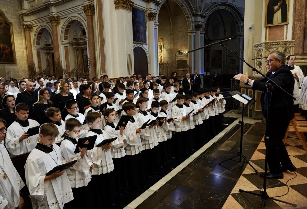 También en el escenario se han situado tres coros: la Escolanía de la Virgen de los Desamparados, la Coral Catedralicia y el Orfeó Valencià y la orquesta sinfónica “La Sinfonietta Valenciana”, bajo la batuta de Luis Garrido.