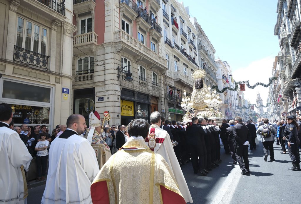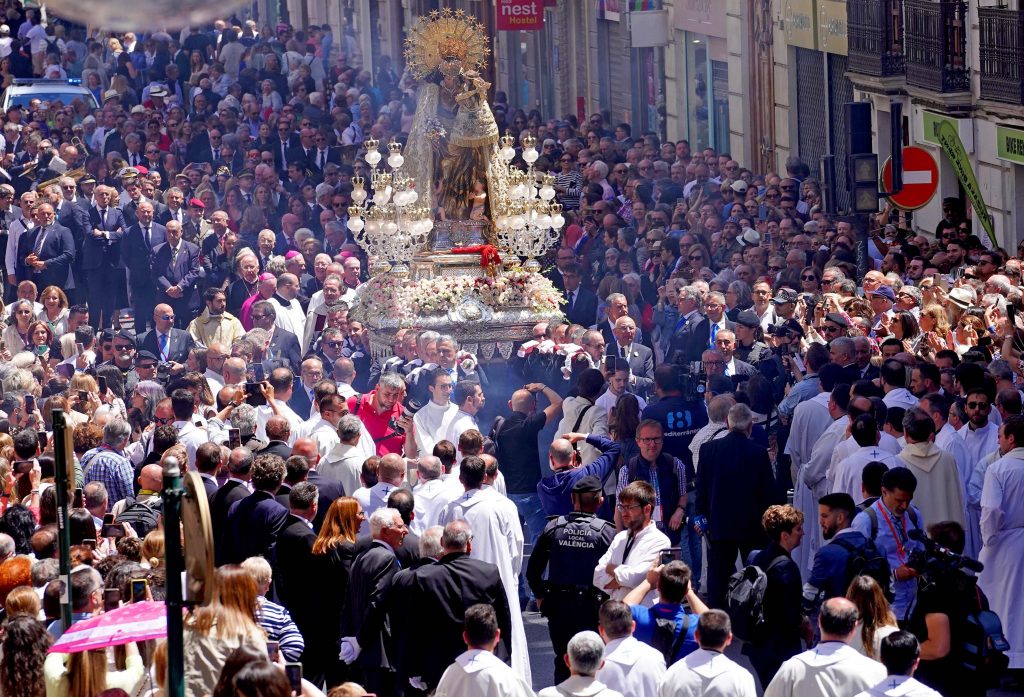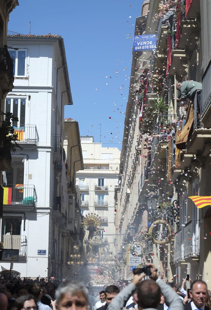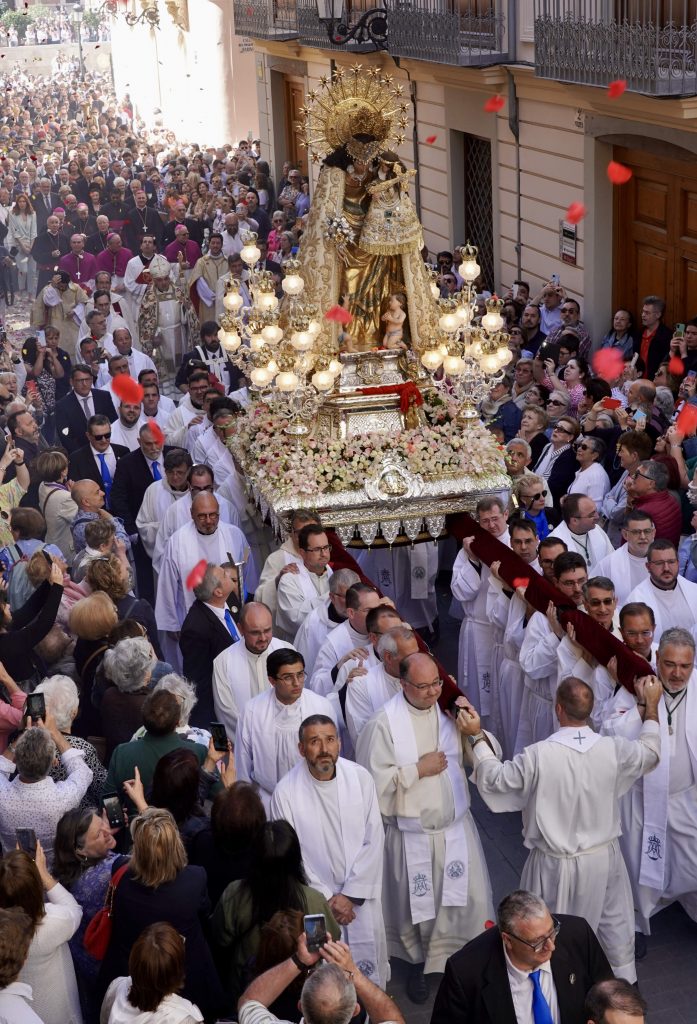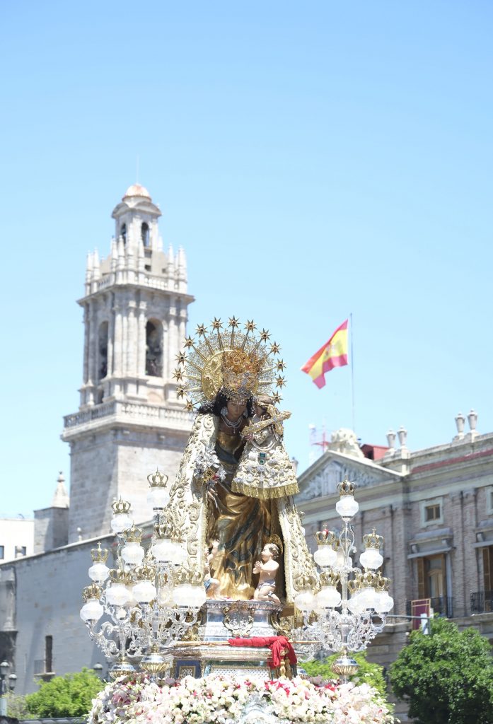La imagen de la Virgen ha sido aclamada por miles de valencianos a lo largo de su recorrido. Aplausos, vítores y lluvia de pétalos desde los balcones engalanados para la Coronación. La procesión se ha detenido en varias ocasiones al ser necesario los cambios para ser portada en hombros, como hace 80 años, y ha tenido tres paradas: con una oración y cantando los gozos frente al Cristo del Salvador; en la calle Trinitarios, con el homenaje de los tunos y ante la iglesia del Temple, con los cantos del Oratorio de Niños Pequeños. En la procesión de regreso a la Basílica se ha detenido en la calle de la Paz a la altura de la Iglesia Santo Tomás Apóstol y San Felipe Neri. Durante todo el recorrido iglesias y parroquias han volteado a mano sus campanas. A su llegada a la Basílica ha sido recibida con los cantos de la Escolanía y con numerosos fieles abarrotando el templo.