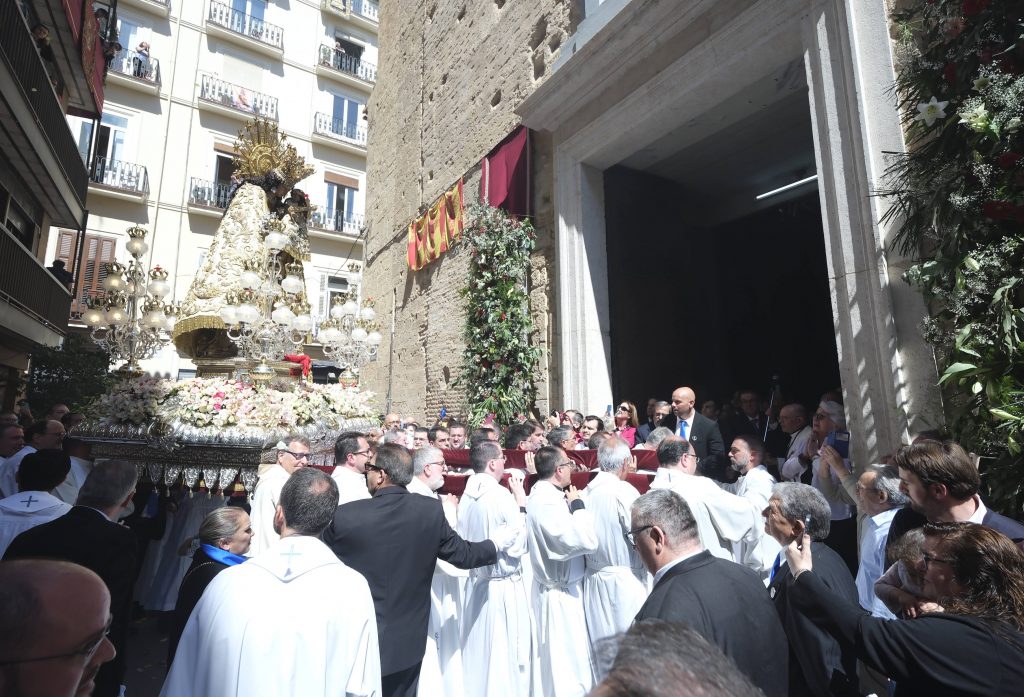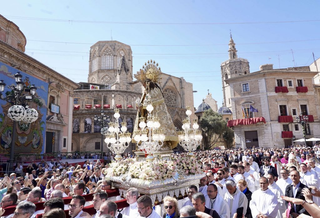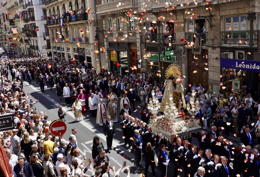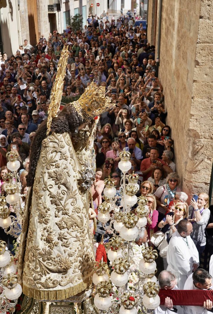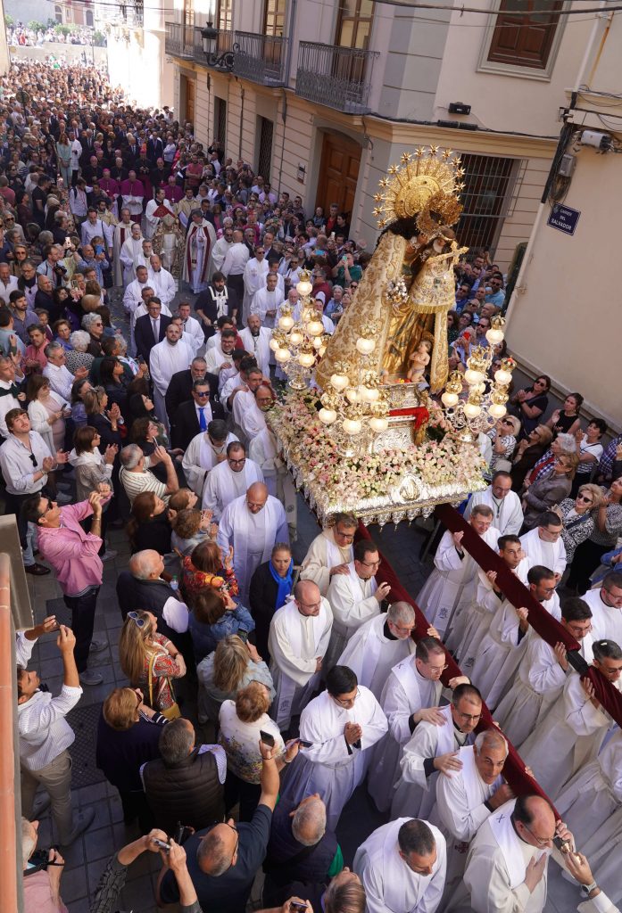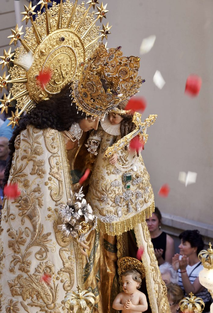 La imagen de la Virgen ha sido aclamada por miles de valencianos a lo largo de su recorrido. Aplausos, vítores y lluvia de pétalos desde los balcones engalanados para la Coronación. La procesión se ha detenido en varias ocasiones al ser necesario los cambios para ser portada en hombros, como hace 80 años, y ha tenido tres paradas: con una oración y cantando los gozos frente al Cristo del Salvador; en la calle Trinitarios, con el homenaje de los tunos y ante la iglesia del Temple, con los cantos del Oratorio de Niños Pequeños. En la procesión de regreso a la Basílica se ha detenido en la calle de la Paz a la altura de la Iglesia Santo Tomás Apóstol y San Felipe Neri. Durante todo el recorrido iglesias y parroquias han volteado a mano sus campanas. A su llegada a la Basílica ha sido recibida con los cantos de la Escolanía y con numerosos fieles abarrotando el templo.