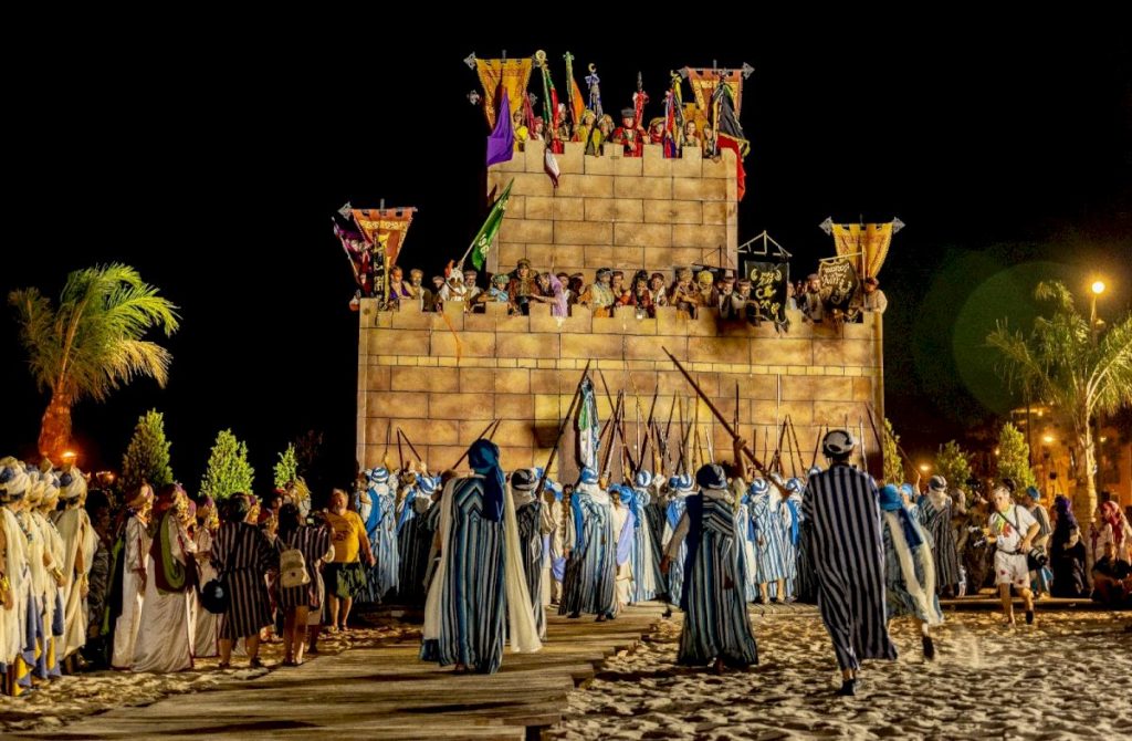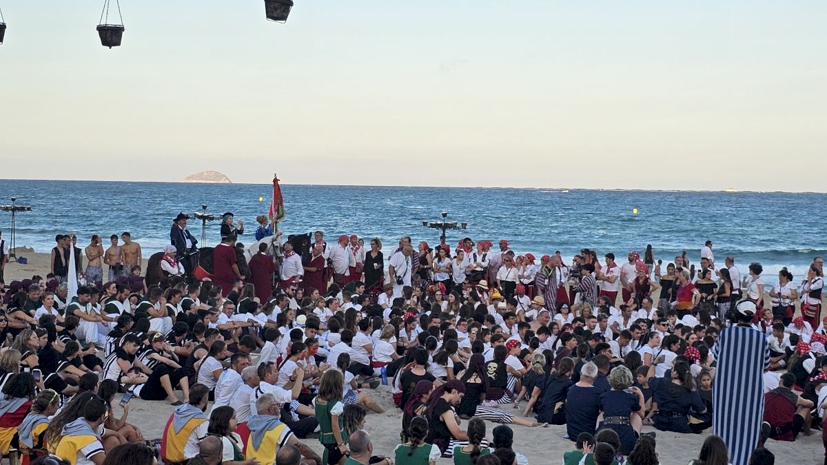 A les 5.00 hores, les tropes cristianes han baixat a la platja centre per la Costera de la Mar després del toc d’alarma i sota la supervisió del Rei Cristià, Maties Romà, de la companyia Pirates Corsaris. que contemplava la baixada de l’exèrcit de la creu des del torrejó de la muralla. Dues hores abans, els moros s’han dirigit al port per embarcar-se. A la platja s’hi ha muntat un campament cristià al costat del castell, on no han parat d’explosionar els arcabussos dels cristians. Mentrestant, les embarcacions móres navegaven per davant de la costa, entre els focs.