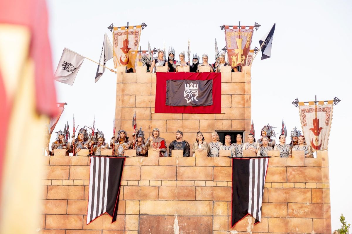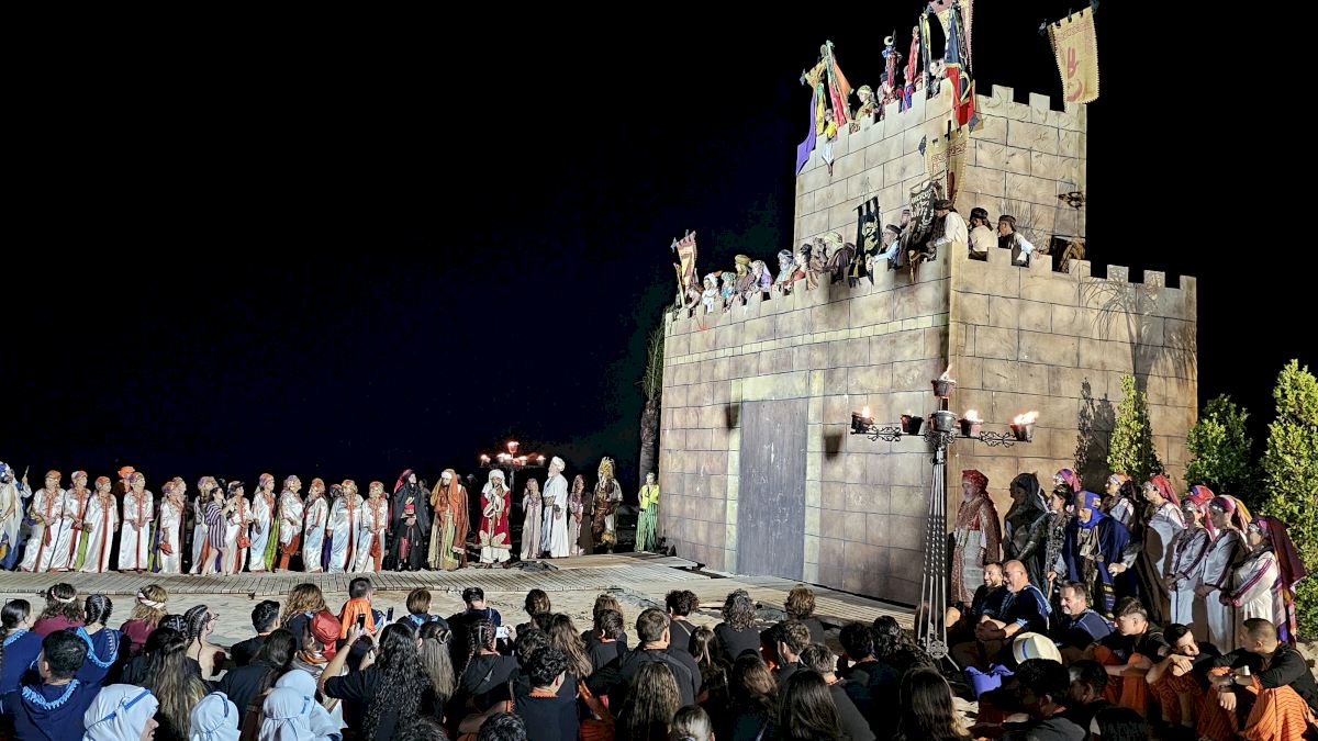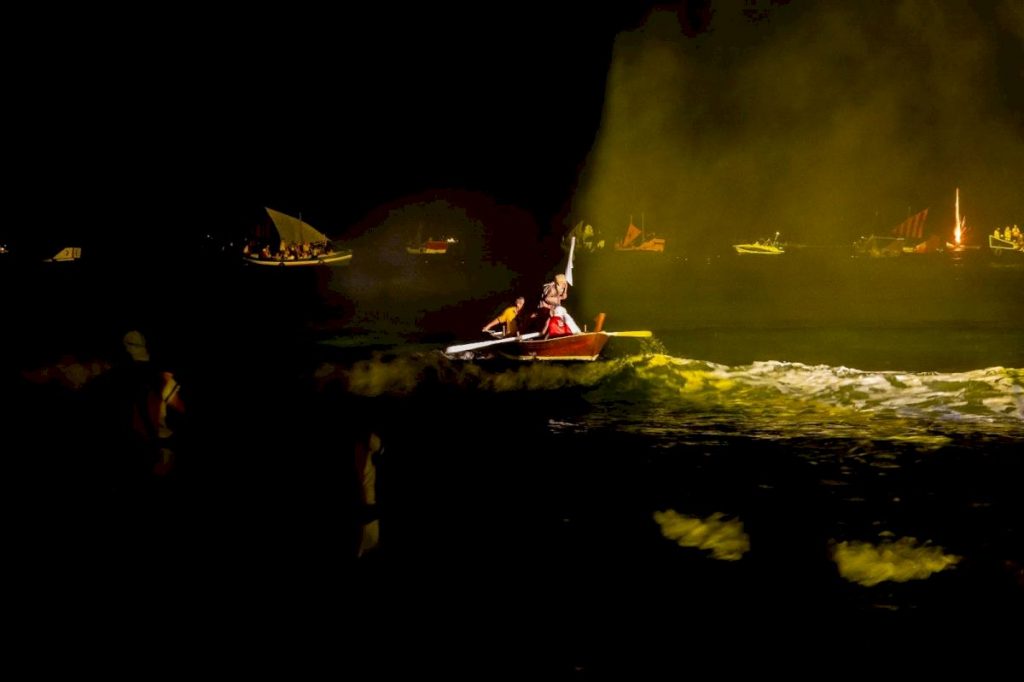 La nit ha arrencat amb un vídeo mapping del Desembarc projectat sobre el Torrejó de la Costera de la Mar. Aquest espectacle audiovisual relata els fets històrics que fonamenten la festa i que es representen al Desembarc. Per això s’ha creat un efecte artístic en un escenari immersiu mitjançant una combinació d’animació, llums, imatges reals i 3D i so amb què el públic ha conegut l’origen de les nostres. Aquesta actuació, que fusiona l’art amb la història i la tecnologia, és finançada per Turisme Comunitat Valenciana. La locució va a càrrec de Ximo Baldó, fester i autor de la portada de la revista de les festes 2024, el Rei Cristià, Maties Romà, i l’Ambaixador Moro, Juan Vicente Llinares.