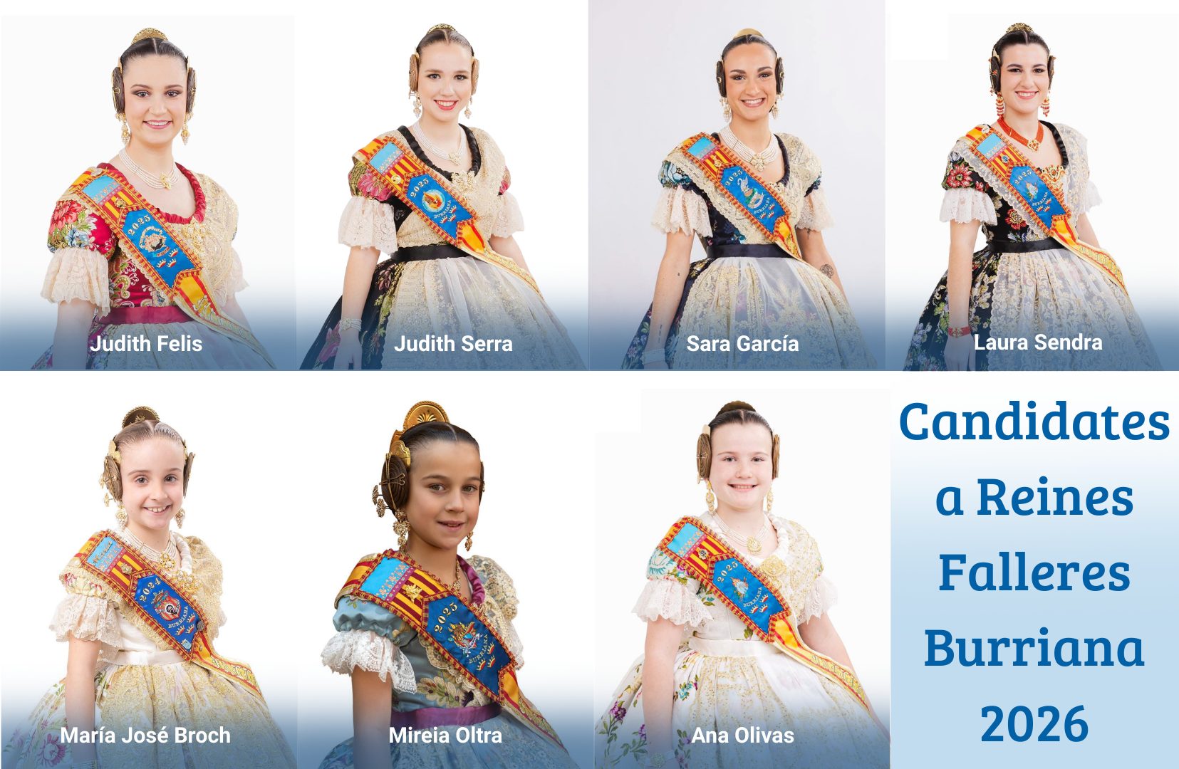 Esta tarde, en las oficinas de Junta Local Fallera, una vez concluido el plazo para presentar dichas candidaturas, se ha revelado el nombre de las 3 niñas y 4 jóvenes que  desean representar a Burriana en las próximas Fallas de 2026. Judith Felis Canut de la Falla Barri La Vila, Judith Serra Domingo de la Falla Societat Cardenal Tarancón, Sara García Serrano de la Falla Barri València y Laura Sendra Muñoz de la Falla Barri La Mercè, optan a lograr el título de Reina Fallera de Burriana. Por su parte, María José Broch Monraval de la Falla Don Bosco, Mireia Oltra Moreno de la Falla Rei Jaume I y Ana Olivas Vidal de la Falla Barri La Mercè, se disputan el puesto de Reina Fallera Infantil.