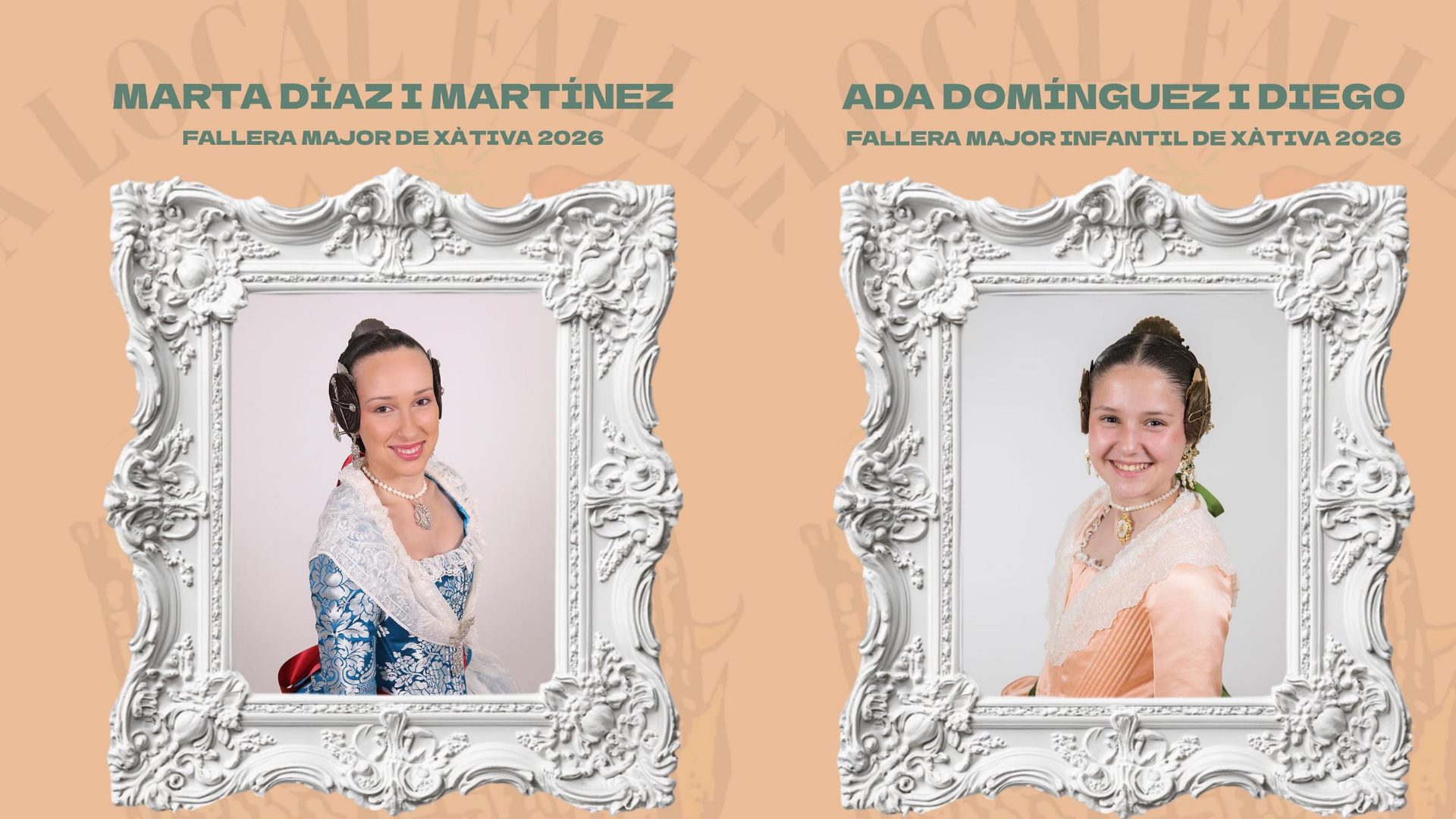 Xàtiva ja coneix a les seues Falleres Majors per a l’any 2026, càrrec que ostentaran Marta Díaz Martínez i Ada Domínguez Diego. La notícia s’ha fet oficial amb la tradicional telefonada que ha tingut lloc aquest dilluns a l’Ajuntament per part de l’alcalde de la ciutat Roger Cerdà i Boluda, amb la presència de la regidora de Cultura Festiva Maria Beltrán i del president de la Junta Local Fallera Paco Sisternes.
