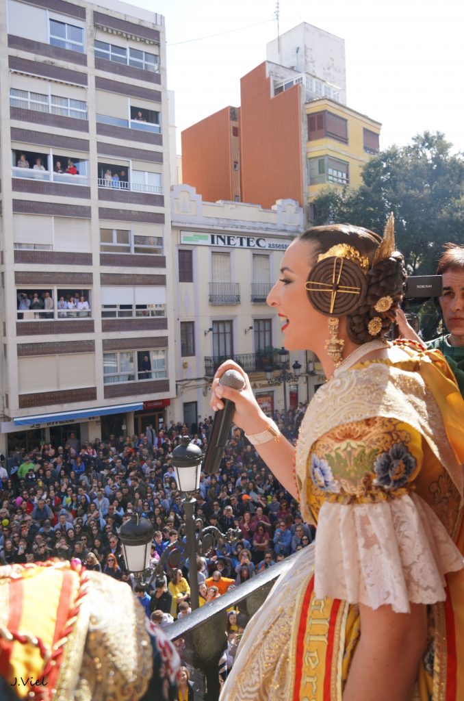 Ja al balcó de l’edifici consistorial, l’alcalde de Sueca, Julián Sáez, va entregar les claus de la ciutat a les Falleres Majors. A continuació, va prendre la paraula la Fallera Major Infantil de Sueca, Adriana Naval, que va nomenar a totes les comissiones per ordre cronològic de la seua fundació : -“les falles es podien comparar amb un conte, que té totes les fulles en blanc, que anirem omplint i escrivint en tinta inesborrable, i va animar als fallers a omplir les fulles d’aquest conte”.