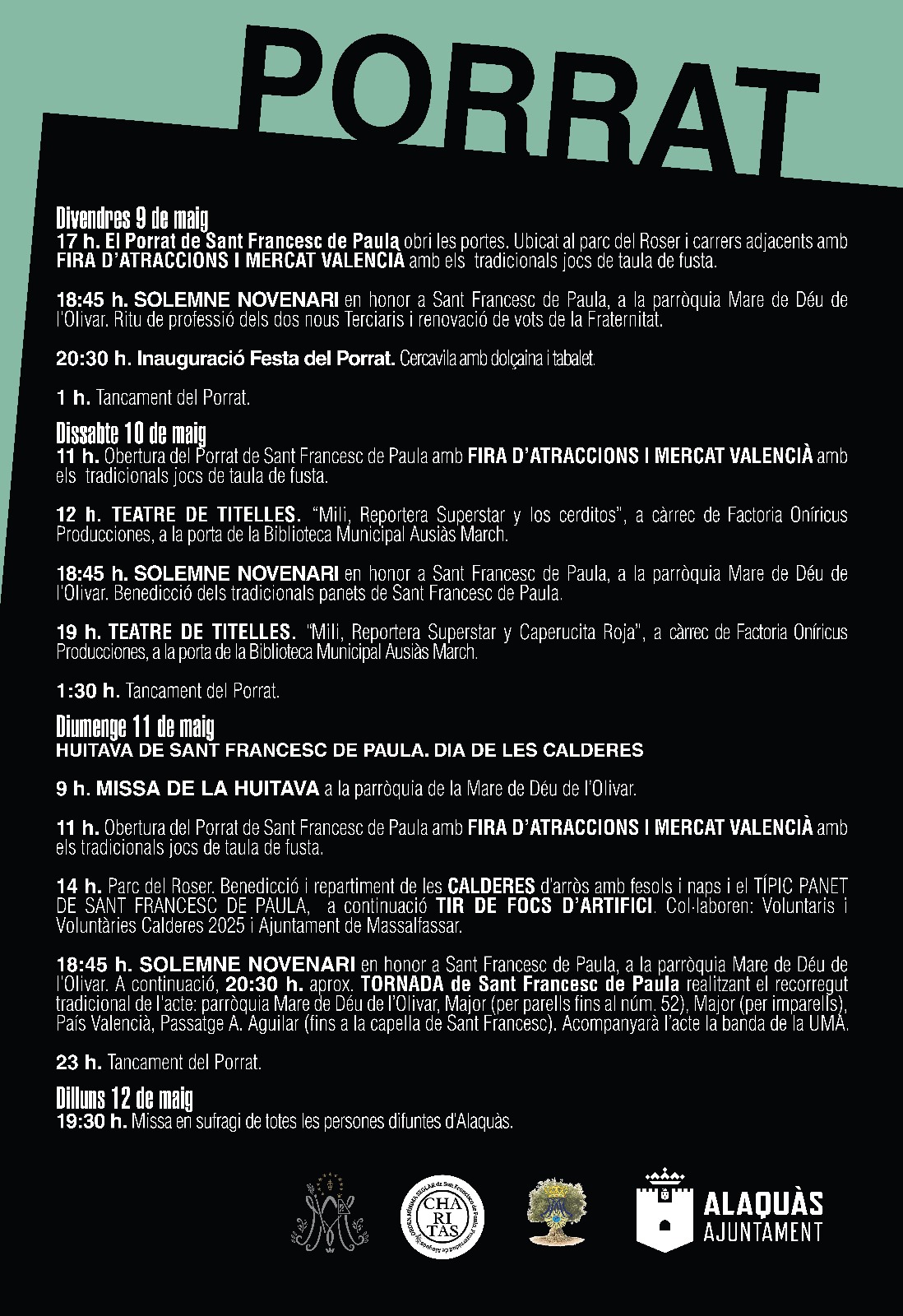 El dissabte 10 de maig la fira obrirà a les 11 i es tancarà a les 1:30 hores. El diumenge 11 de maig arribarà l’esperat Dia de les Calderes d’arròs amb fesols naps, el repartiment de vora 5.000 racions gratuïtes i el típic panet de Sant Francesc de Paula i el tir de focs d’artifici. A les 20:30 hores tindrà lloc la tornada de Sant Francesc de Paula posant fi i final a la festivitat amb l’acompanyament de la Unió Musical d’Alaquàs. El Porrat 2025 es tancarà a les 23 hores.