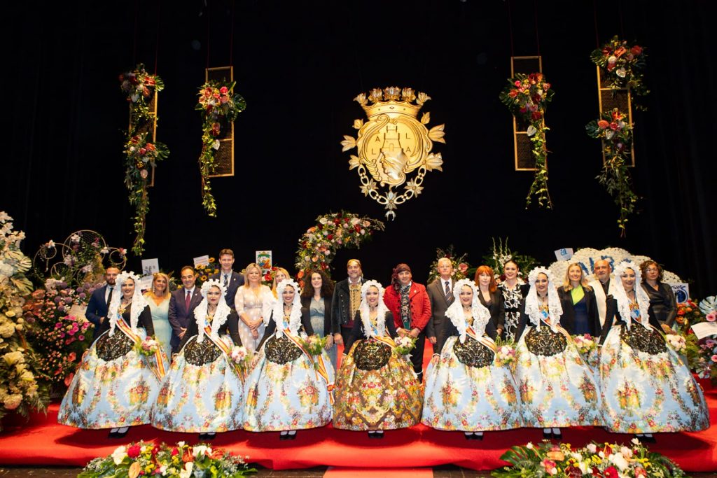 El alcalde de Alicante, Luis Barcala, ha impuesto este sábado, en el Teatro Principal, la banda a Alba Muñoz, de la hoguera Florida-Portazgo, para proclamarla como Bellesa del Foc 2024. Antes ha sido el presidente de la Federación de Fogueres de Sant Joan (FFSJ), David Olivares, quien ha distinguido a las Damas de Honor, Lucía González (Los Ángeles), Alba Caturla (San Antón Alto), María Huesca (San Blas), Mar León (Sant Blai de Baix), Laura Ramírez (Benalúa) y María Martínez (Hernán Cortés). Tanto ellas como la Bellesa han recibido también el Emblema de Oro de la FFSJ. Jorge Tejedo, vicepresidente de la Federación de Fallas de Burriana, ha ejercido como mantenedor en un acto que ha contado con la actuación de la Banda Sinfónica Municipal, dirigida por Pedro Lara.