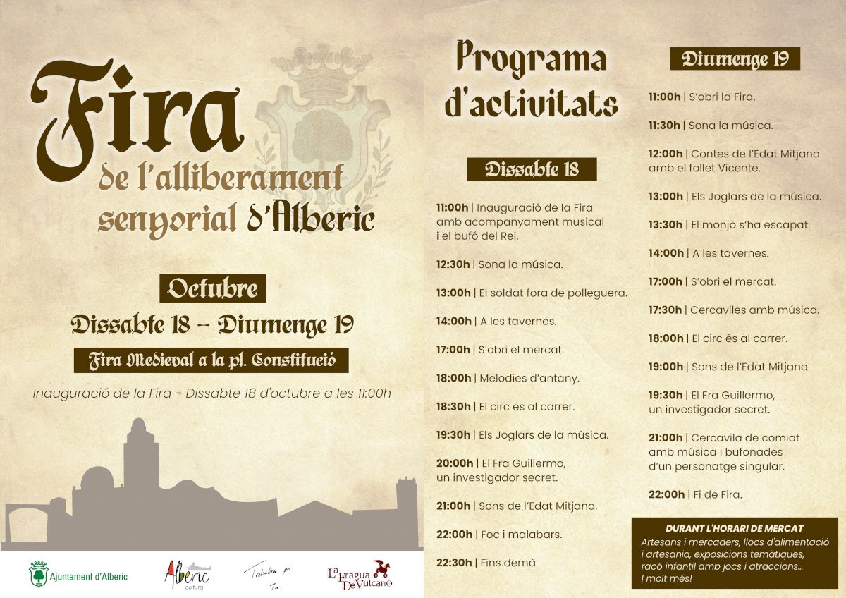 Este cap de setmana, dissabte 18 i diumenge 19 d’octubre, Alberic celebrarà la desena edició de la Fira de l’Alliberament Senyorial amb un mercat medieval ubicat a la plaça de la Constitució del municipi, junt a l’edifici consistorial. La fira s’inaugurarà el dissabte 18 a les 11:00 hores i comptarà amb una programació que s’estendrà fins a les 22:00 hores del diumenge. La música, els espectacles circenses, les paradetes de productes artesans i d’alimentació, les exposicions temàtiques o els jocs infantils seran alguns dels atractius del mercat.