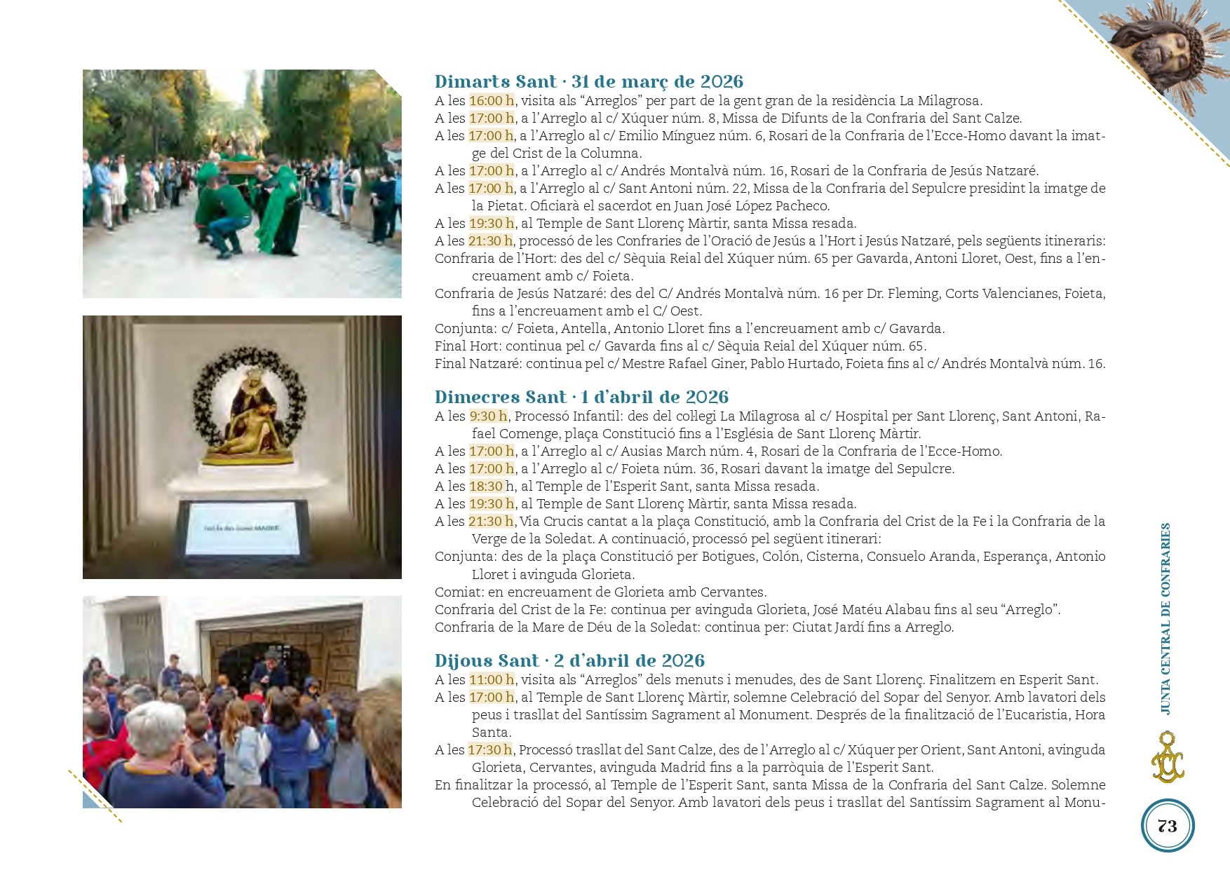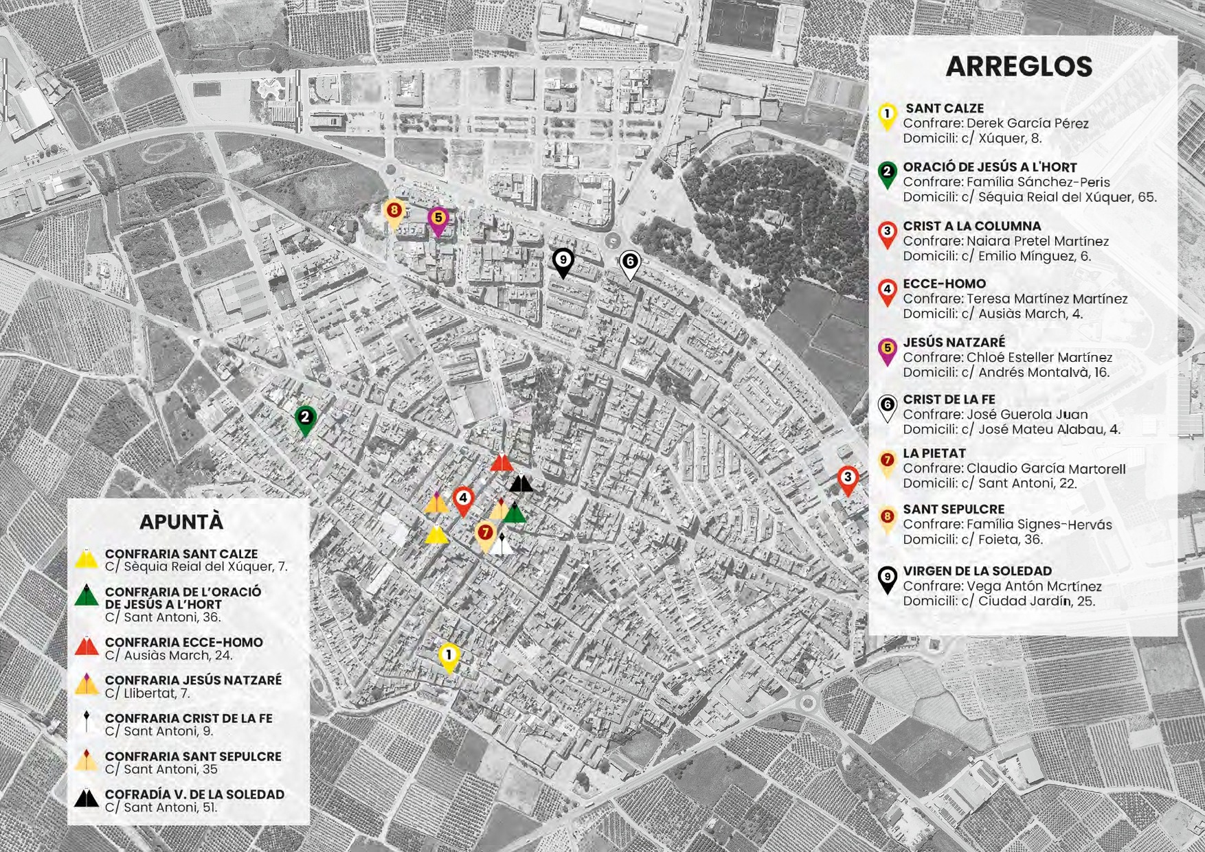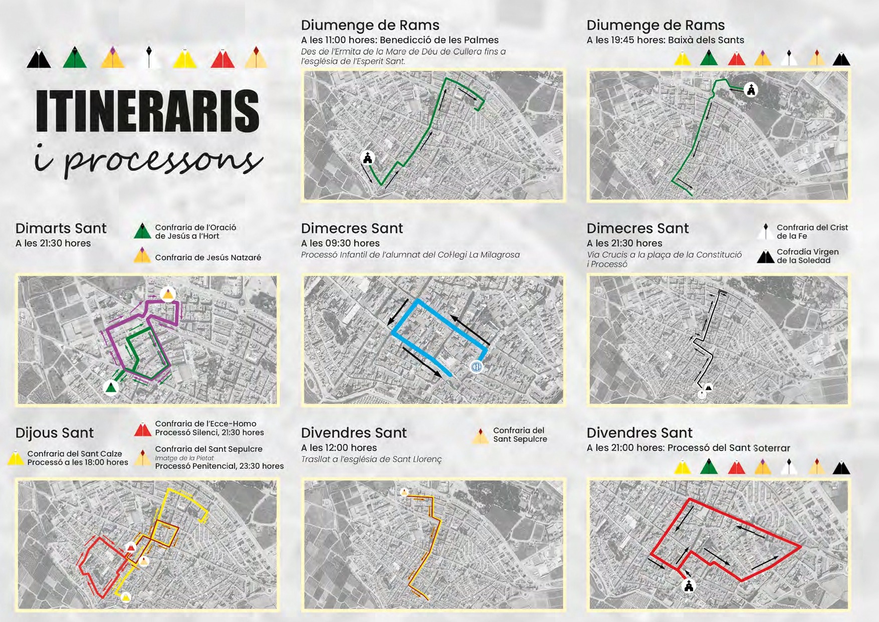 Amb les imatges al domicili de cada confrare major, el dilluns 30 de març les portes de cada casa s’obriran per a mostrar al poble els Arreglos, escenografies elaborades amb moltíssima estima que es converteixen en l’atractiu al llarg de tota la setmana. Durant els dies següents, les processons ocuparan el calendari fins a arribar al Divendres Sant (3 d’abril) i la Solemníssima Processó General del Sant Soterrament, amb inici i final a l’església de Sant Llorenç.