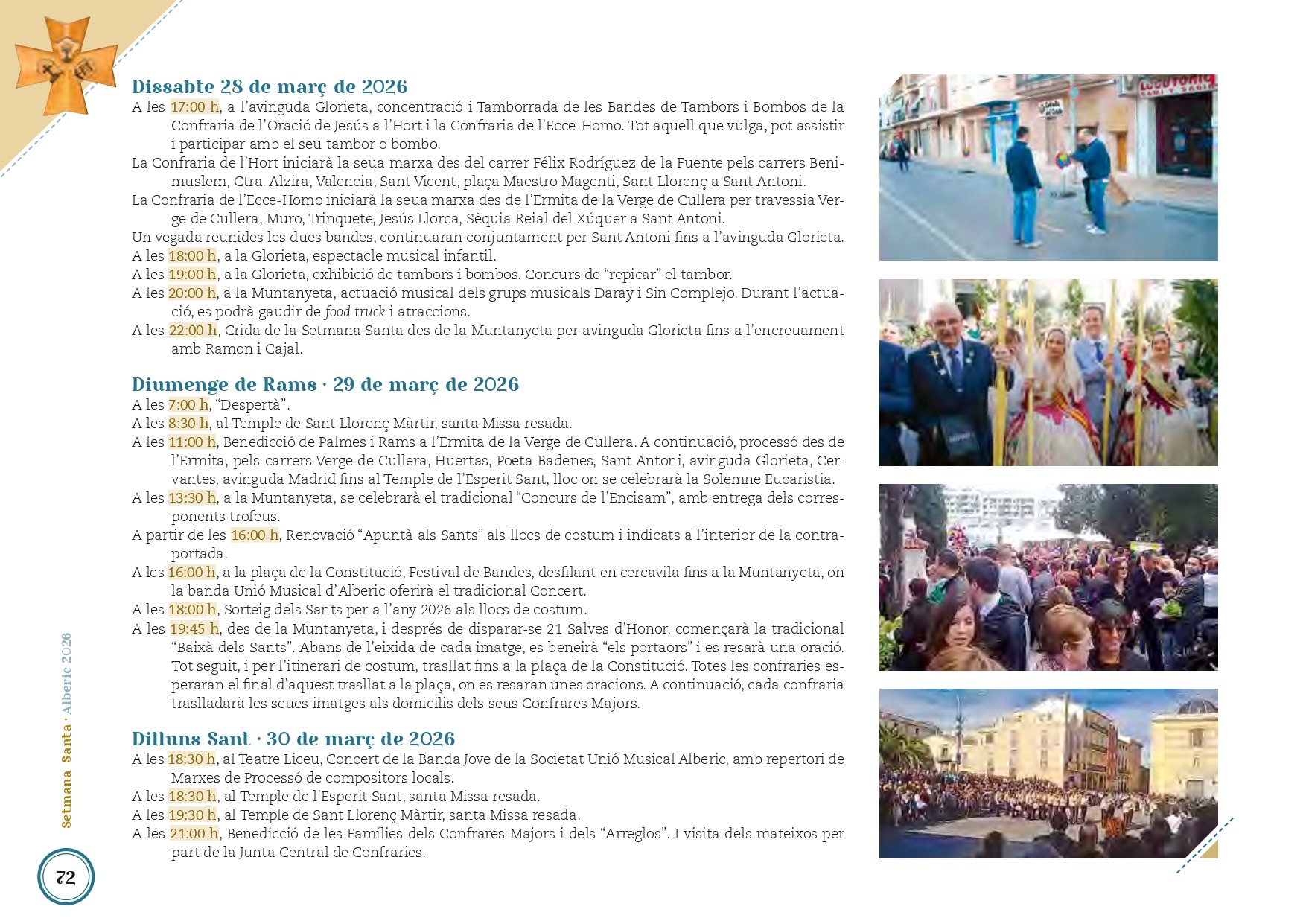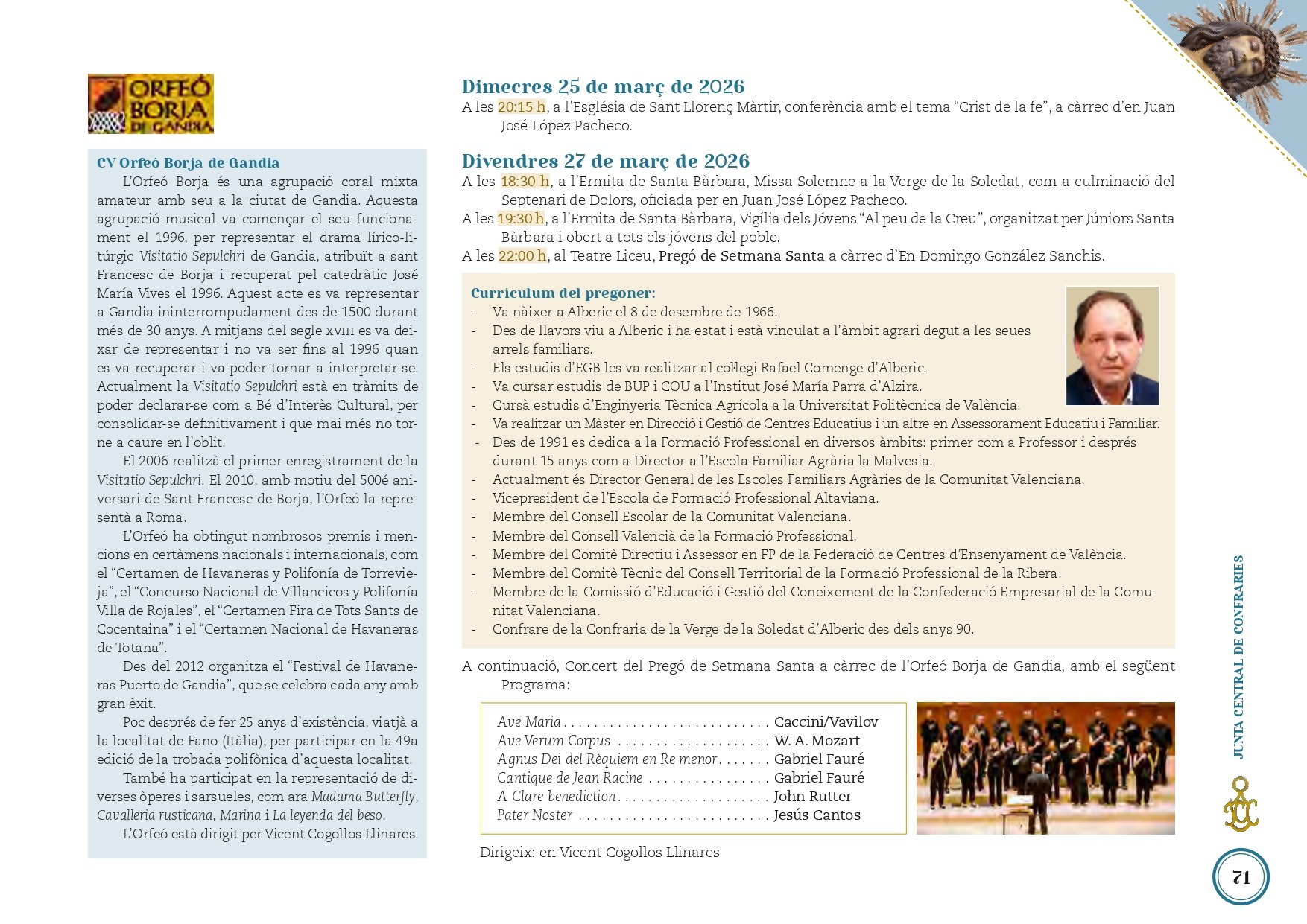 Alberic conta els dies que resten per a donar inici a la seua celebració més important, el Diumenge de Rams i la Setmana Santa. Enguany, esta festivitat que mou milers de veïnes i veïns començarà oficialment el divendres 27 de març amb el Pregó de Domingo González Sanchis, des del Teatre Liceu, a partir de les 22.00 hores. Seguidament al pregó, al mateix teatre tindrà lloc el Concert de l’Orfeó Borja de Gandia.