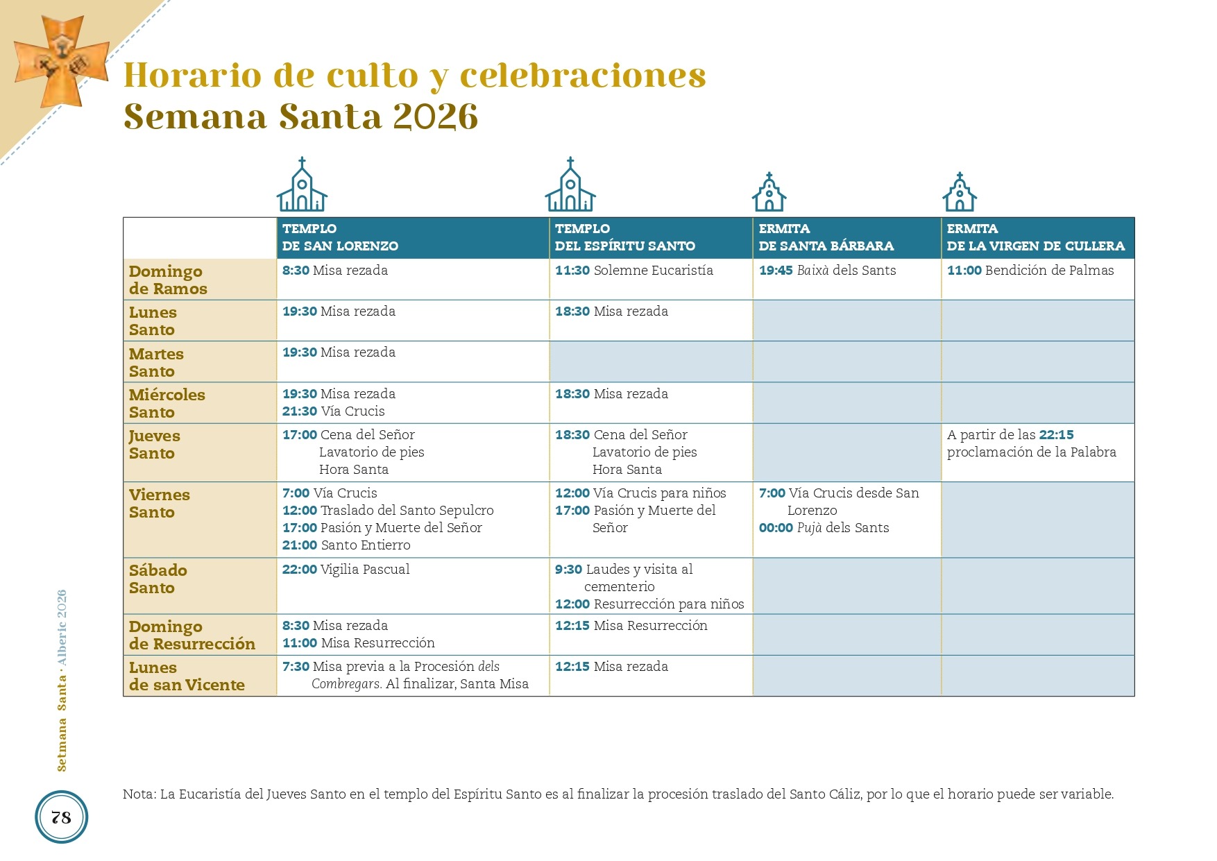 Arribats al Diumenge de Rams, 29 de març, el matí començarà a les 07.00h amb la despertà, seguida de la Santa Missa Ressada al temple de Sant Llorenç. En finalitzar el culte, a les 11.00 hores es procedirà a la Benedicció dels Rams i les Palmes a l’ermita de la Verge de Cullera. Des de l’ermita, les i els assistents es desplaçaran en processó fins a l’església de l’Esperit Sant, on se celebrarà la Solemne Eucaristia.