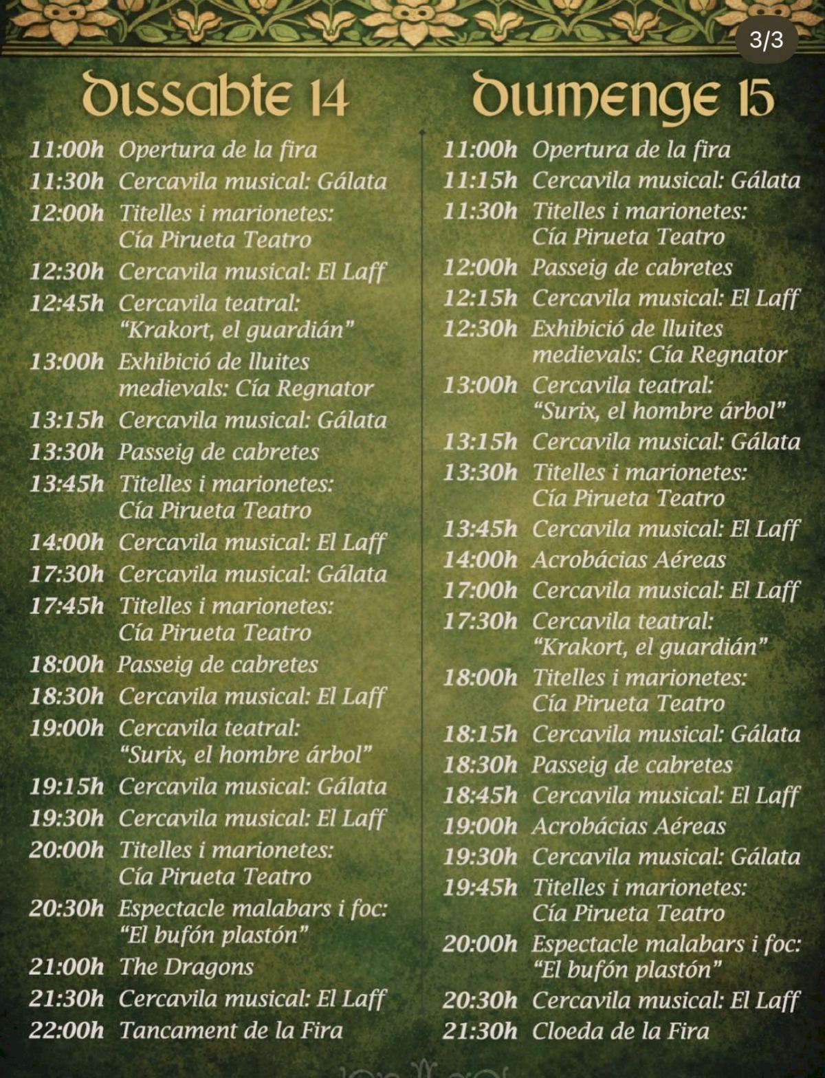 La programación arrancará el viernes 13 con la inauguración oficial a las 19:00 horas, acompañada de cercavilas musicales y actividades infantiles. Durante el sábado y el domingo, desde las 11:00 horas, se sucederán pasacalles musicales, espectáculos teatrales, títeres y marionetas, exhibiciones de luchas medievales, paseos de cabretes, acrobacias aéreas y espectáculos de fuego, culminando cada jornada con actuaciones musicales y el cierre de la feria.