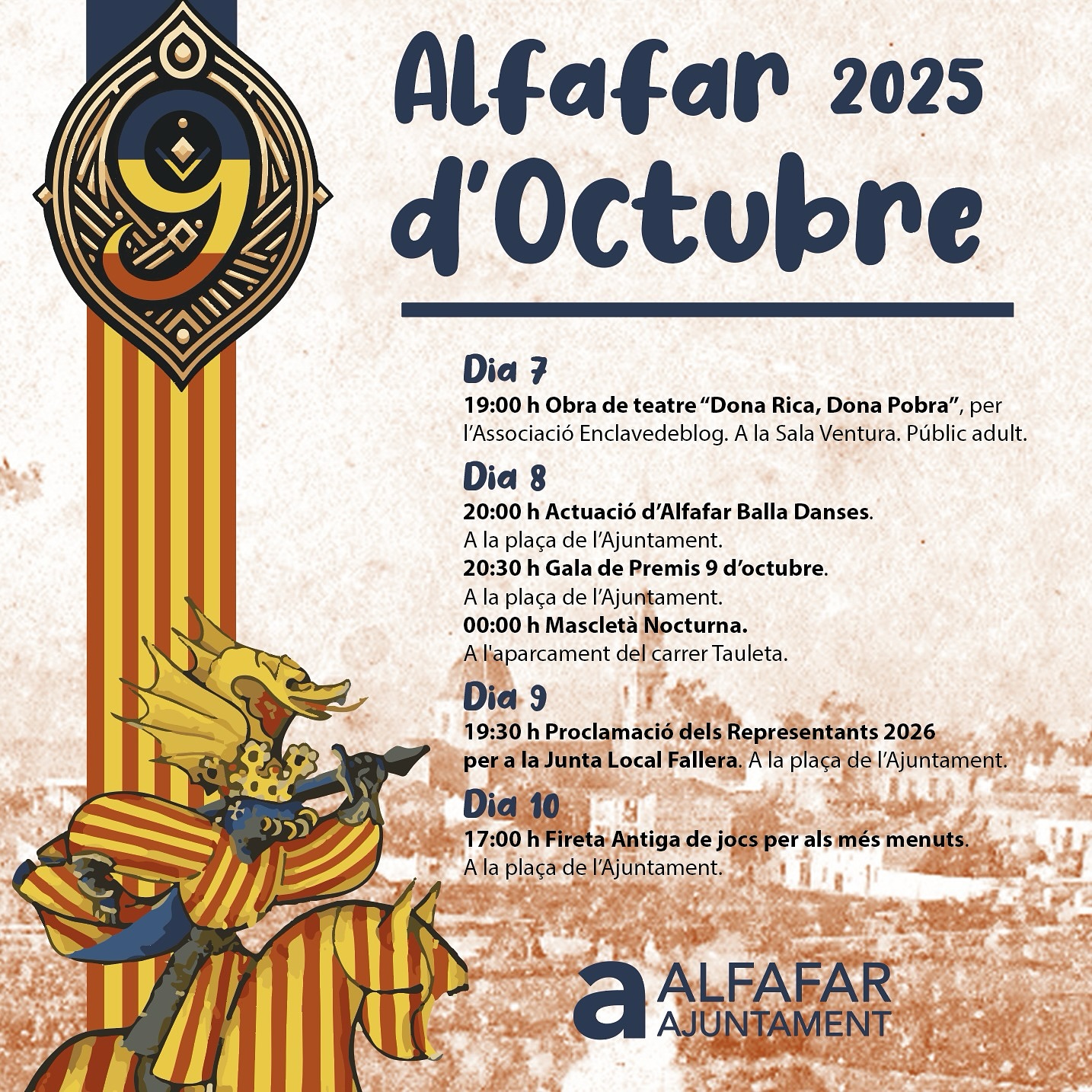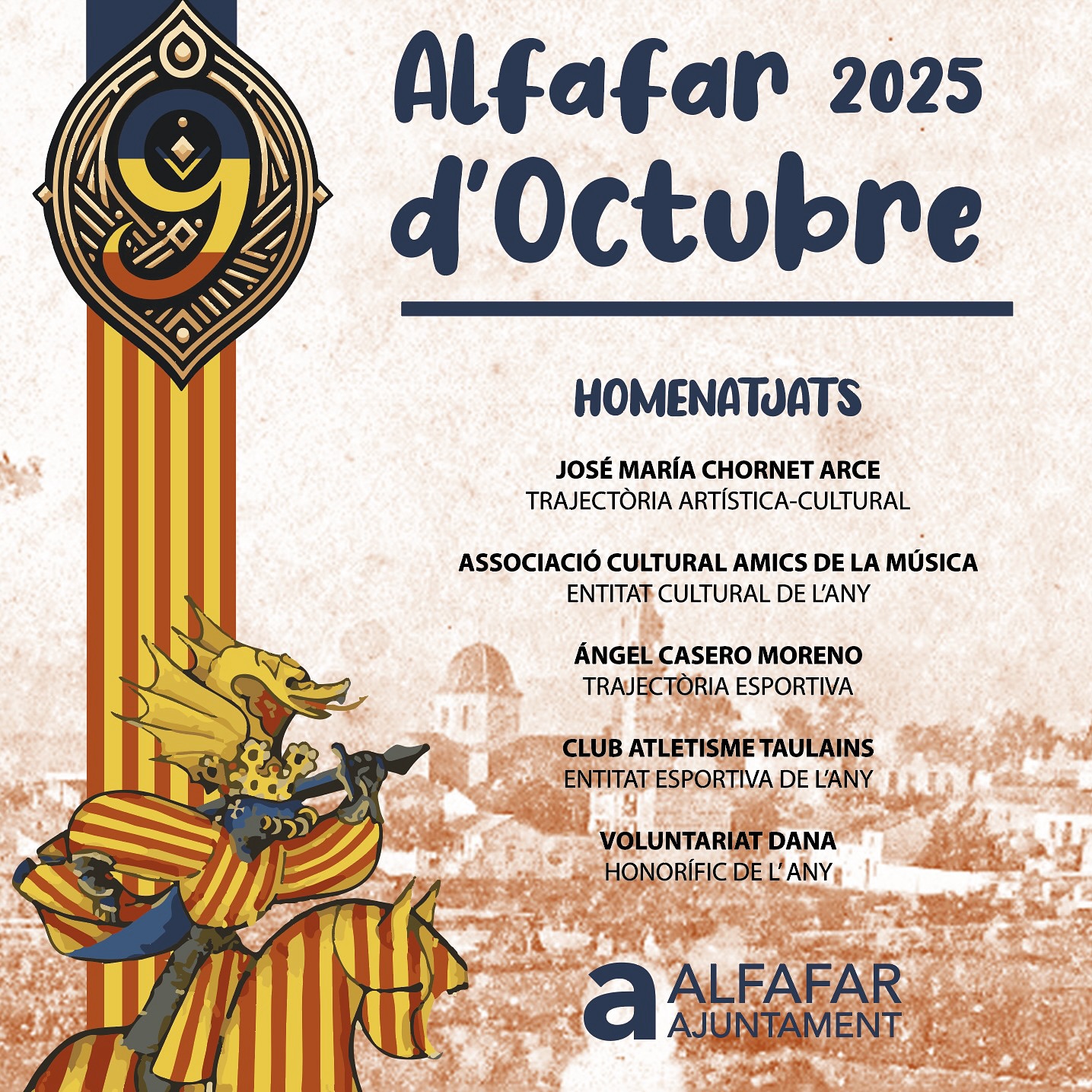El Ayuntamiento de Alfafar ha presentado la programación de actos para conmemorar el 9 d’Octubre, Día de la Comunitat Valenciana, con actividades culturales y festivas que se desarrollarán entre el 7 y el 10 de octubre.