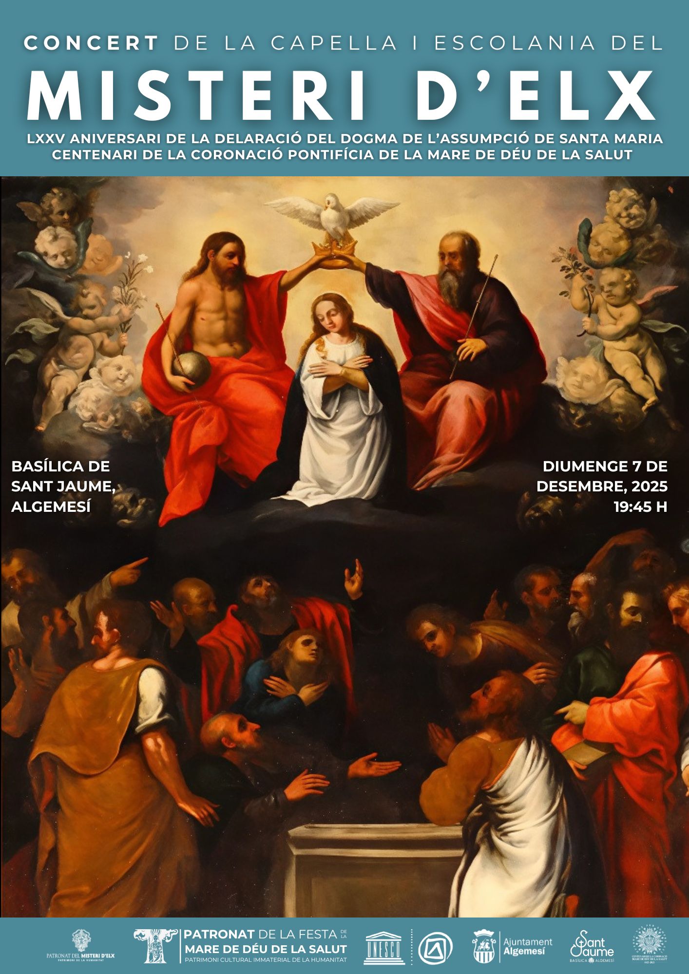 El Patronat de la Festa de la Mare de Déu de la Salut d’Algemesí anuncia la celebració d’un concert extraordinari a càrrec de l’Escolania i la Capella del Misteri d’Elx, que tindrà lloc el diumenge 7 de desembre de 2025, vespra de la Solemnitat de la Immaculada Concepció, a les 19:45 h, en la Basílica Menor de Sant Jaume Apòstol.