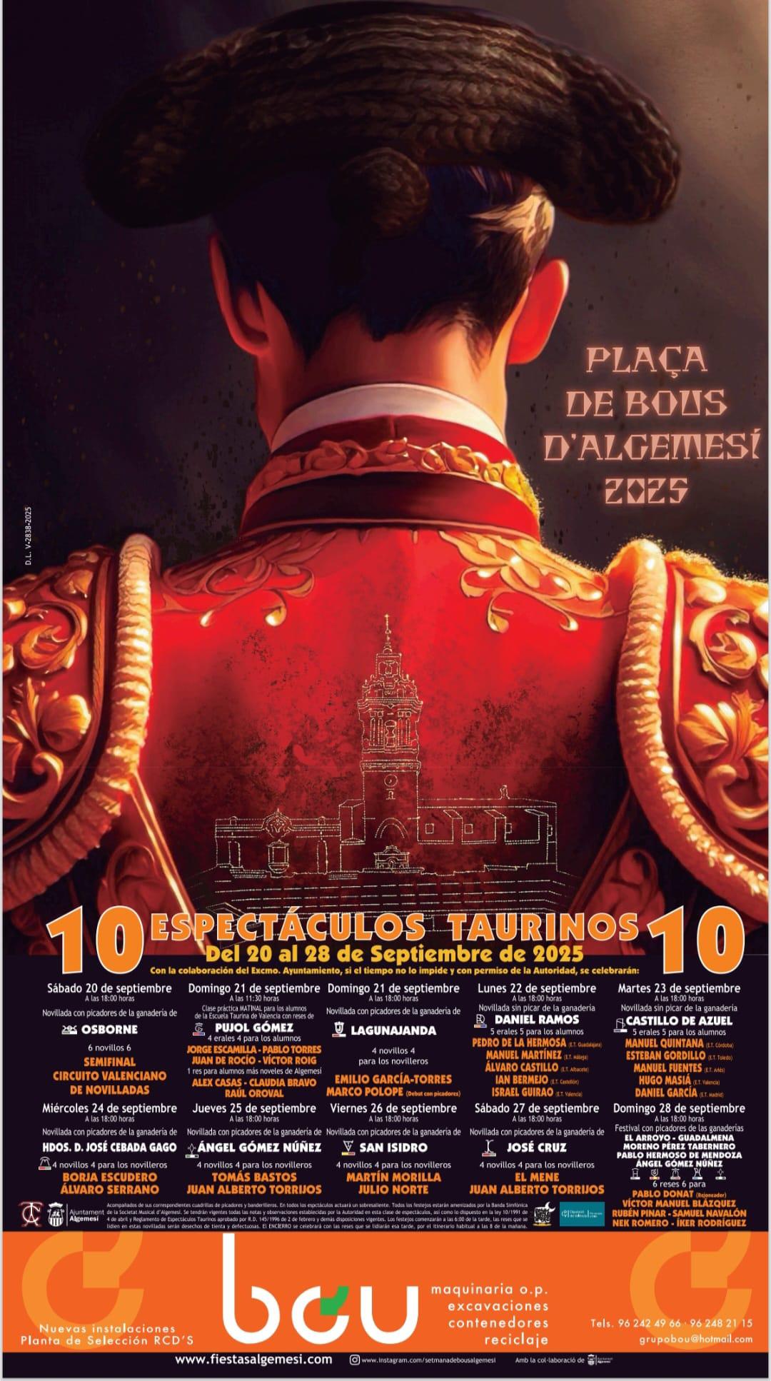 El tret d’eixida arribarà el divendres 19 de setembre amb el tradicional “Xupinasso”, que tindrà lloc davant del Casino Lliberal i que marcarà l’inici d’una setmana en què la plaça de bous tornarà a omplir-se d’activitat. El programa taurí inclou deu festejos que es desenvoluparan cada vesprada fins al 28 de setembre, amb l’única excepció de la classe pràctica matinal organitzada per l’Escola Taurina de València, prevista per al diumenge 21 a les onze i mitja del matí. Alguns d’estos festejos comptaran amb la participació de joves algemesinencs, reforçant així el caràcter formatiu i intergeneracional que caracteritza esta celebració.
