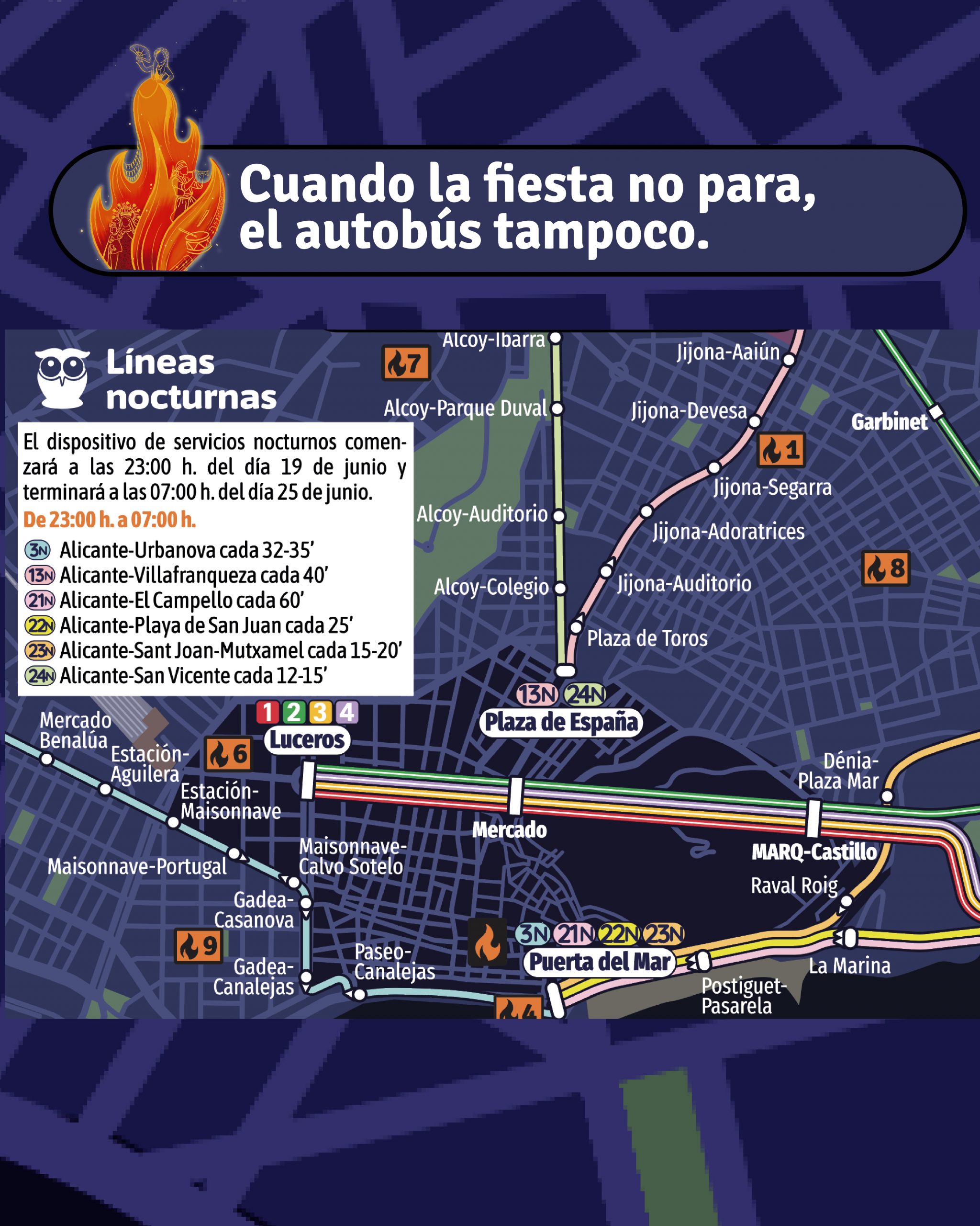 El resto de líneas que también se vean afectadas por la presencia de monumentos fogueriles, barracas, racós o calles adornadas, también tendrán sus oportunos desvíos, de los que se informará puntualmente por el operador del servicio a través de su web https://alicante.vectalia.es/alertas/.