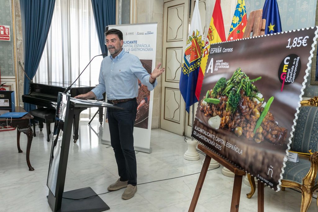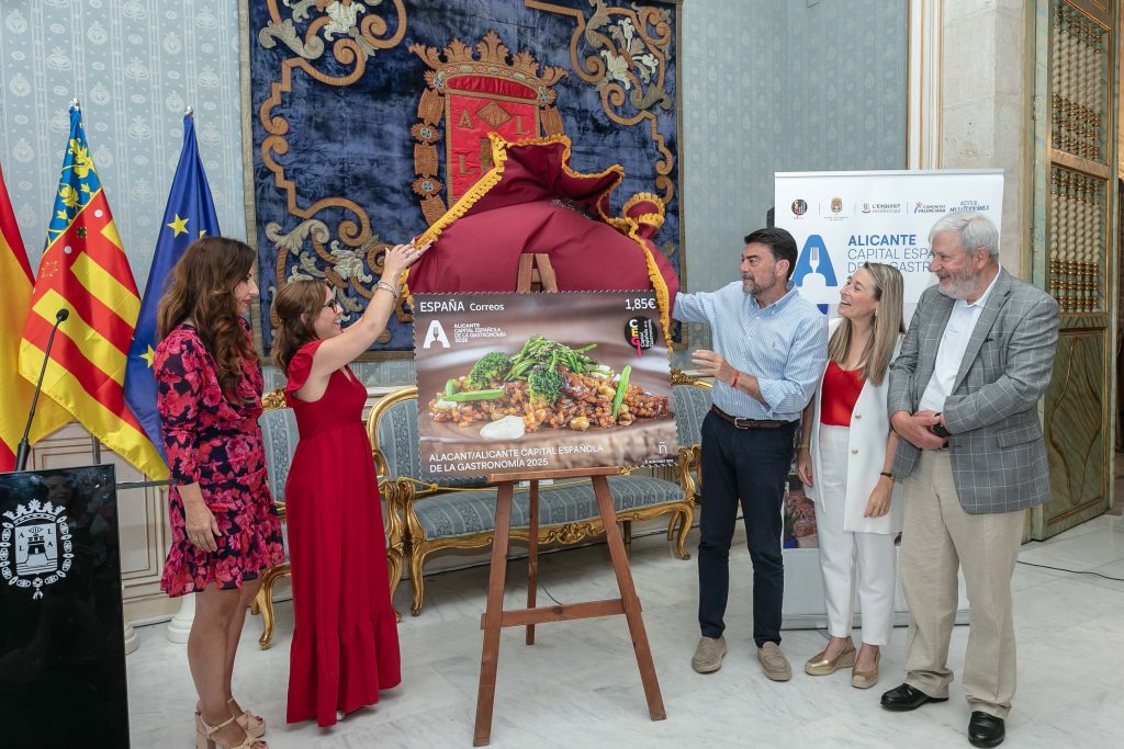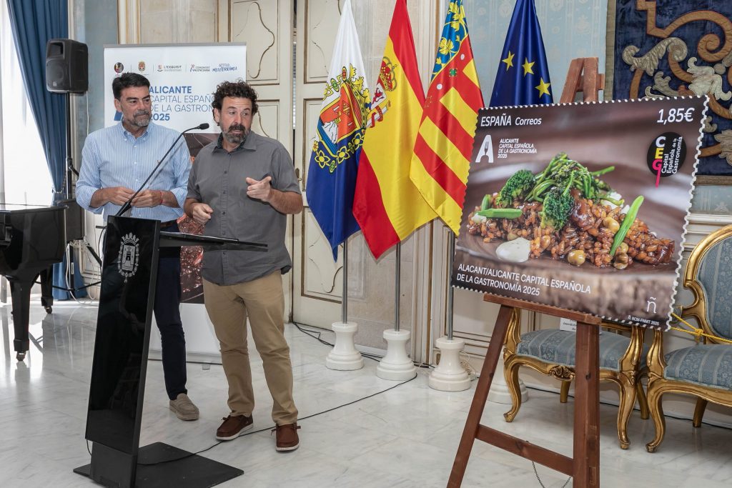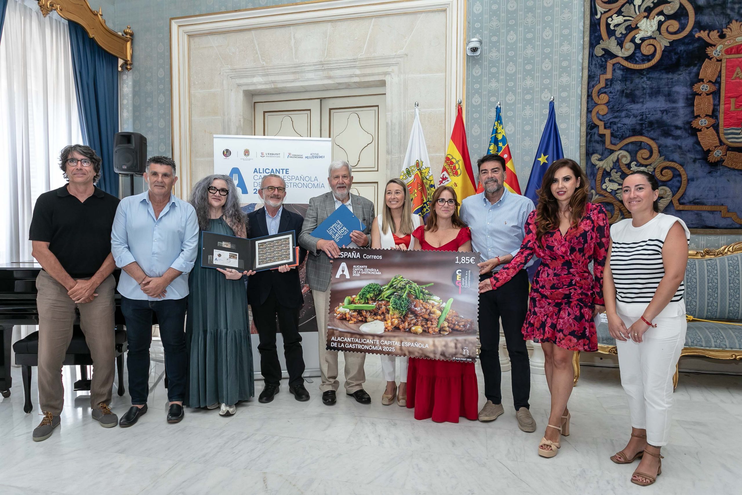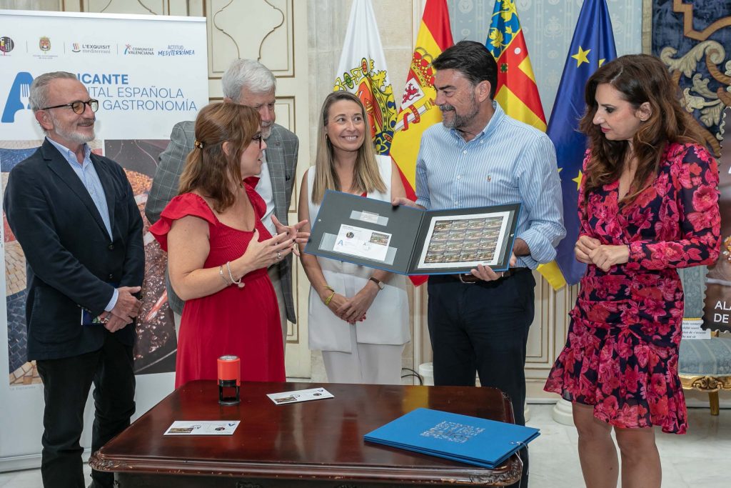 Alicante Capital Española de la Gastronomía ya tiene sello propio. Correos ha dedicado a este nombramiento un sello postal que ya ha puesto en circulación y del que se imprimirán 90.000 ejemplares. El alcalde, Luis Barcala, ha presentado este miércoles en el Salón Azul este sello junto a la directora de Filatelia y Relaciones Institucionales de Correos, Nuria Lera, y al presidente de Capital Española de la Gastronomía, Mariano Palacín.