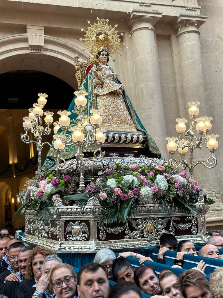 El trono de la Virgen ha estrenado iluminación y el lecho floral ha sido elaborado por integrantes de la Real Archicofradía, a base de tonos rosas, malvas y verdes. Desde el pasado sábado se ha podido contemplar la imagen junto al Altar Mayor de la Concatedral y han sido infinidad de fieles y visitantes quienes han contemplado de cerca a la denominada cariñosamente ‘Perla de Alicante’.
