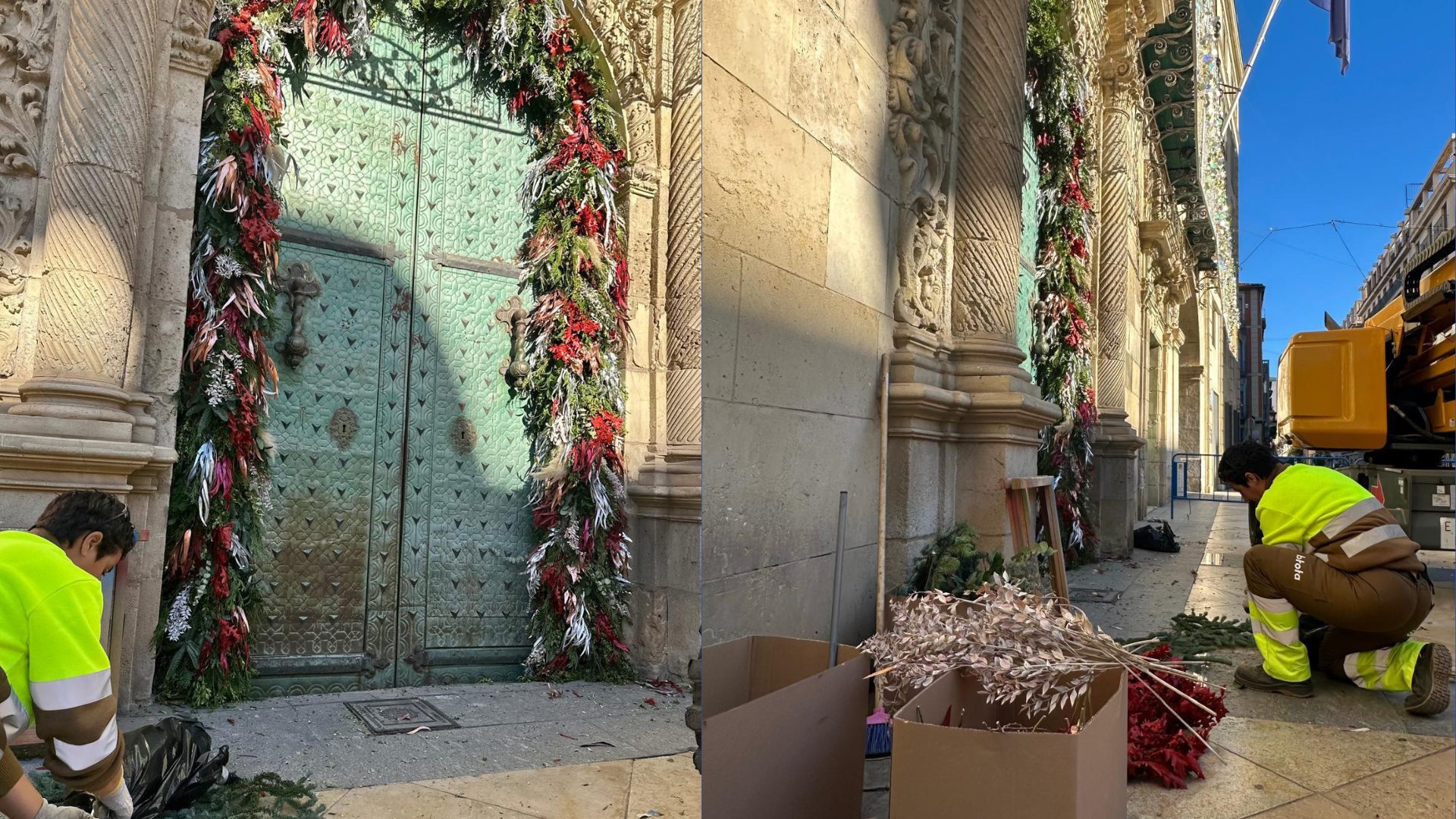 Alicante ha comenzado a completar la decoración navideña de la Plaza del Ayuntamiento, con el adorno floral de la fachada de la Casa Consistorial. Ésta se une al Belén Monumental, Libro Guinness de los Récords desde 2020, al alumbrado extraordinaria que circunda el perímetro de este enclave, y a la visita al belén del zaguán que, bajo el lema ‘Hace 2025 años nació en Belén’, ha montado la Asociación de Belenistas, que preside Alejandro Cánovas. Los empleados de la empresa concesionaria STV Gestión, dependientes del departamento de Zonas Verdes de la concejalía de Parques y Jardines, que dirige Rafa Alemañ, han situado en la fachada dos arcos y otras tantas columnas de Navidad. Todo, sobre fondo verde, elaborado con material vegetal natural con los colores propios de la Natividad como son plata, cobre, y oro viejo.