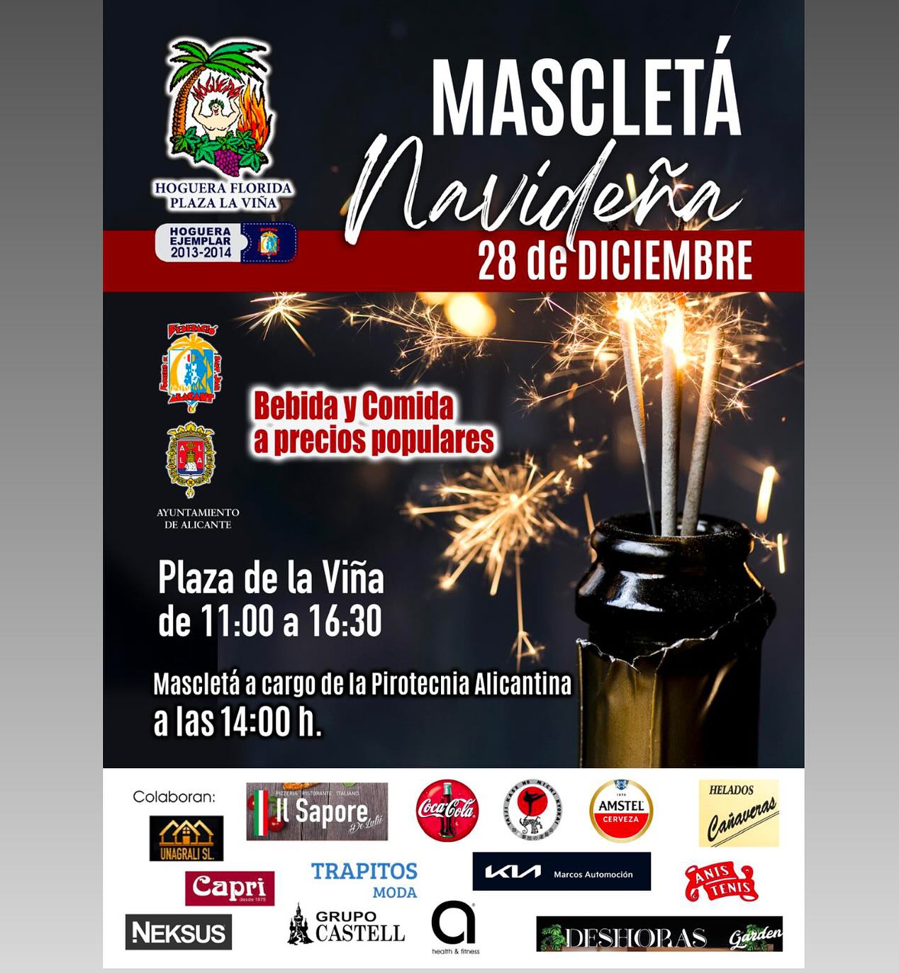 Como ya hemos dicho, el primer espectáculo pirotécnico será este sábado 28 de diciembre en la Plaza de la Viña a las 14h. El distrito Florida – Plaza de la Viña organiza esta mascletà que será disparada por la Pirotecnia Alicantina del maestro pirotécnico Pedro Luis Sirvent. Además la comisión, ofrecerá un almuerzo con precios populares desde las 11h para compartir una jornada navideña llena de convivencia.