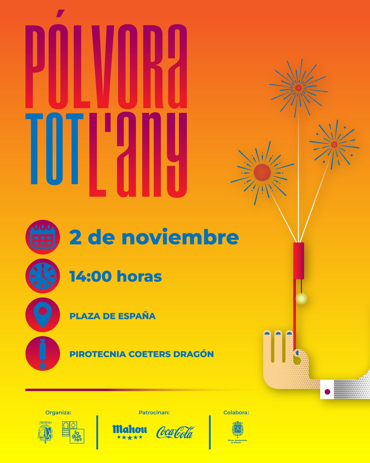 Este domingo 2 de noviembre, la pirotecnia continua con el ciclo «Pólvora Tot l´Any» que organiza la Federació de Fogueres de Sant Joan. El disparo será a las 14h en la Plaza de España (enfrente de la Plaza de Toros) y correrá a cargo de la Pirotecnia Coeters Dragón de Villena.