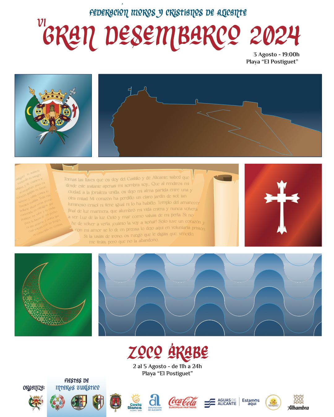 El cartel que anuncia el Desembarco es original de John López. El autor ha incidido en que “se ha buscado más la faceta cultural de lo que suponen las celebraciones de Moros y Cristianos”. Lo ha dividido en tres partes. En la inferior alude al bando de la Media Luna; la central la ocupa un extracto del texto de las capitulaciones, y la superior está referida a Alicante con la representación del monte Benacantil y la Cara del Moro