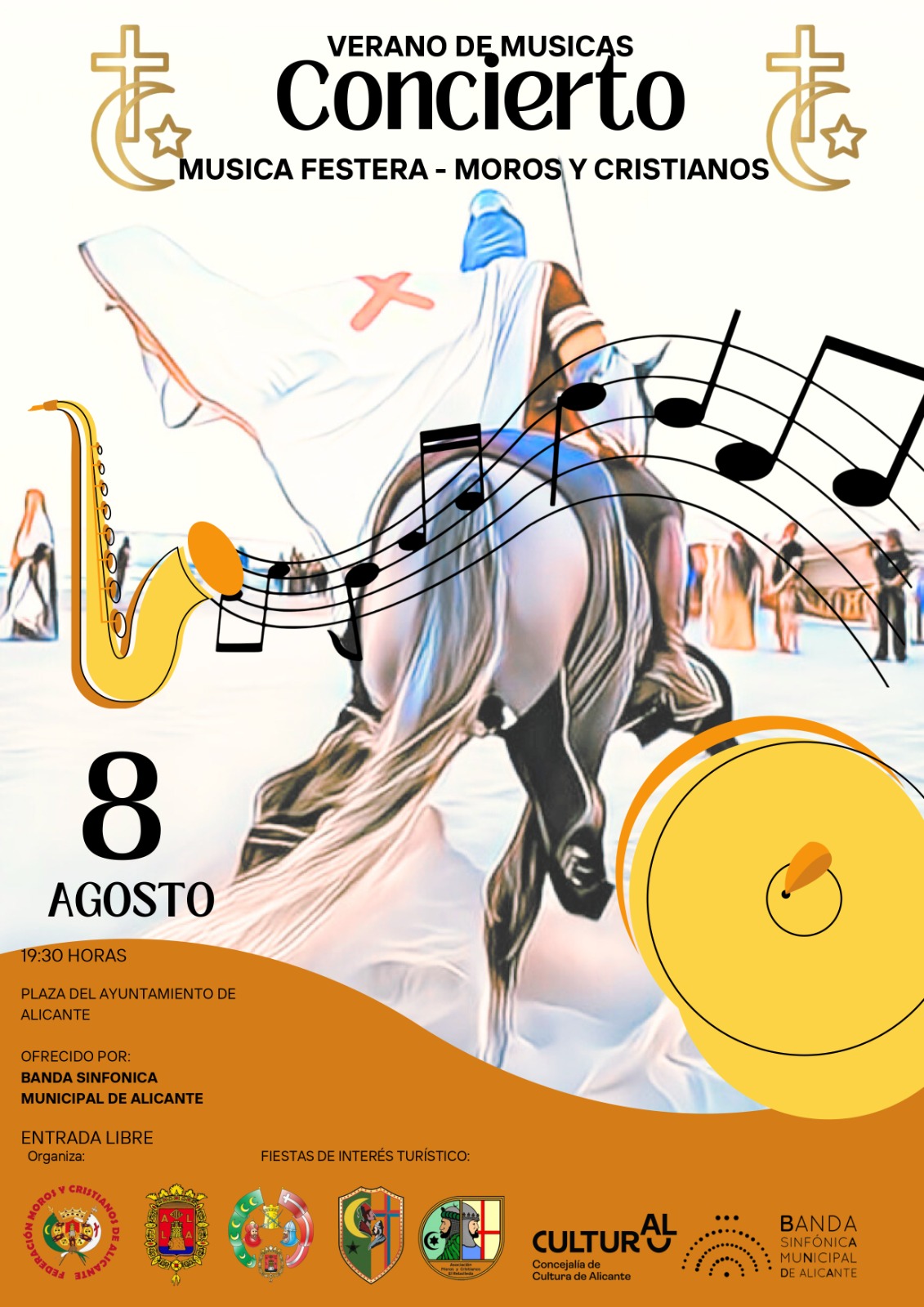 La presencia de los Moros y Cristianos en Alicante tendrá una nueva cita el jueves 8 de agosto. Será, a partir de las 19.30 horas, en la Plaza del Ayuntamiento dentro de ciclo ‘Verano de músicas’. La Banda Sinfónica Municipal de Alicante, dirigida por Pedro Lara, interpretará un total de doce composiciones, entre pasodobles cristianos y marchas moras y cristianas. El concierto se cerrará con la interpretación de ‘Alacant, mora i cristiana’, original de Rubén Urbán, y que está considerada como el himno oficial de la FMYCA.