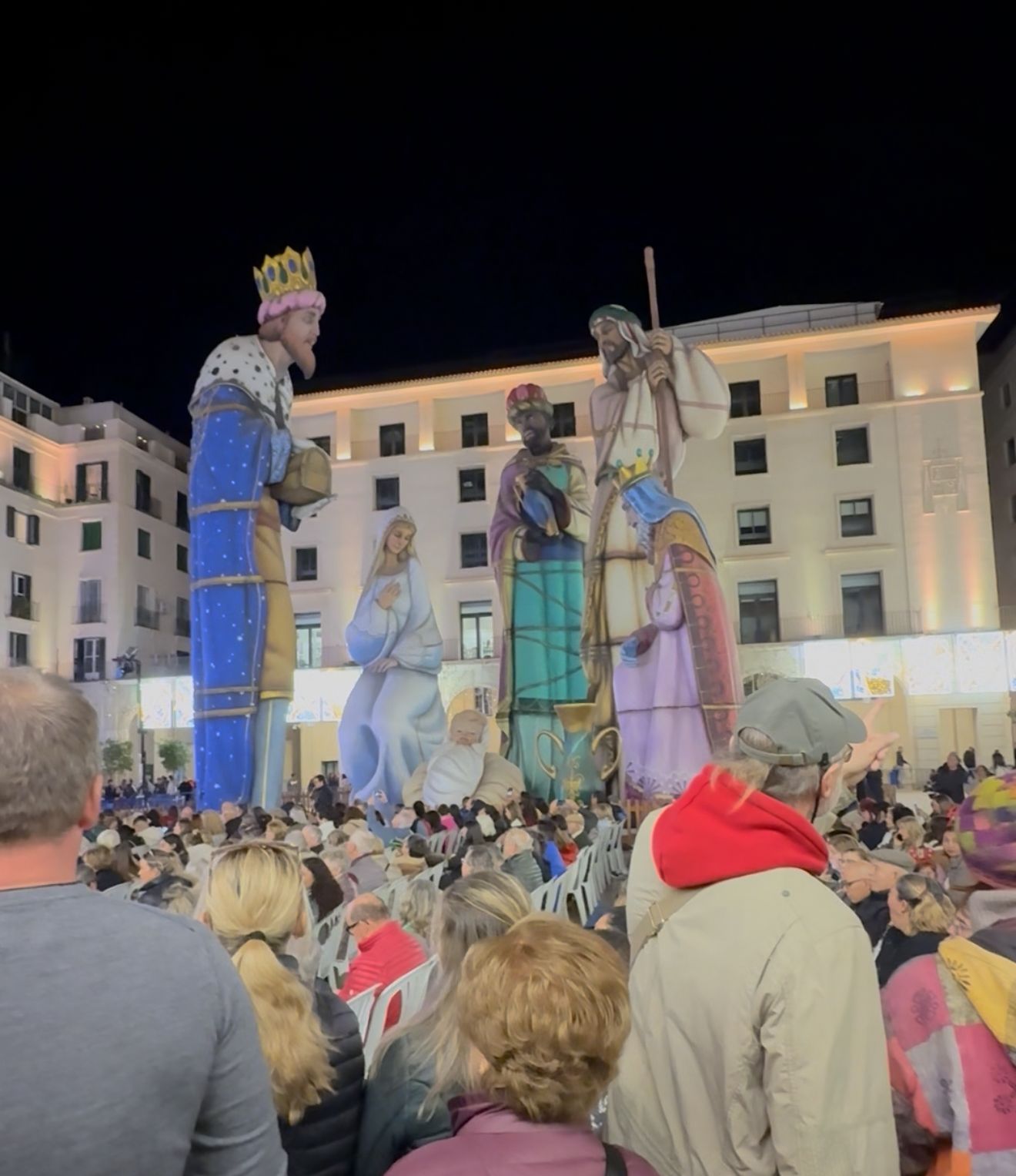La figura de San José mide 17 metros. Diez, la de la Virgen María, y 3,25 metros el Niño Jesús. En cuanto a los Reyes Magos, son 11 metros de alto los que tiene Melchor; 15,6 metros alcanza Gaspar, y 16 son los metros de altura de Baltasar. Todas ellas son originales del artista de hogueras José María García ‘Pachi’.
