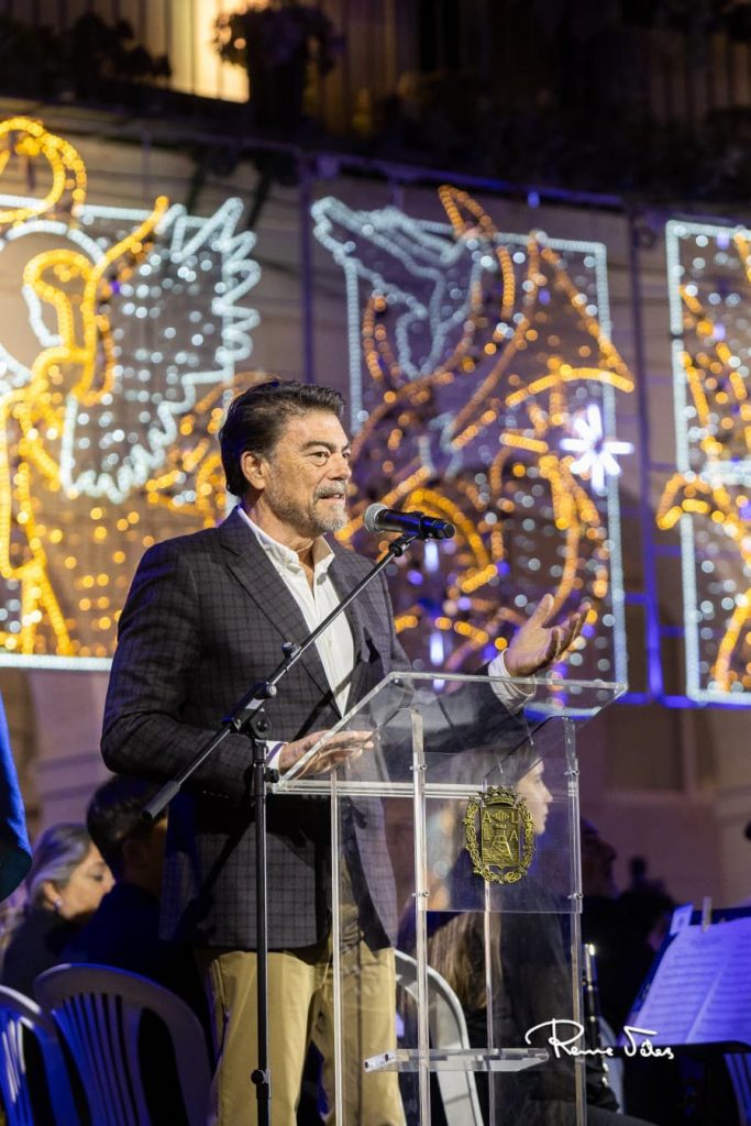 La inauguración ha contado con un espectáculo de luz y sonido. La Compañía Lírica Alicantina, dirigida por Christian Lindsey, ha interpretado fragmentos de la ópera ‘Marina’, original de Emilio Arrieta. Ha continuado con la fantasía musical ‘El Reno Mágico’, obra de Ferrer Ferrán, antes de que se escuchara la composición ‘Santa Claus», interpretada por los integrantes de la Asociación Musical de la Sociedad Cultural Deportiva Carolinas, dirigida por Jaume Pascual Sirera, y la voz de la cantautora alicantina, Inés Domínguez. Ha finalizado con la interpretación conjunta del ‘Hallelujah’, del cantautor Leonard Cohen, y del Himno de Alicante, de Juan Latorre.