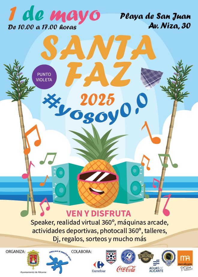 El Ayuntamiento de Alicante celebrará el próximo jueves, 1 de mayo, la sexta edición de la Santa Faz 0,0. Una fiesta que ofrece a los jóvenes un programa de actividades de ocio saludable en la playa de San Juan, el día de la Romería de Santa Faz. Este año la fiesta se desarrollará en en la avenida de Niza, 30, concretamente en el entorno del restaurante Aitana y amplía su horario, desde las 10.00 hasta las 17.00 horas, y su oferta lúdica y deportiva.