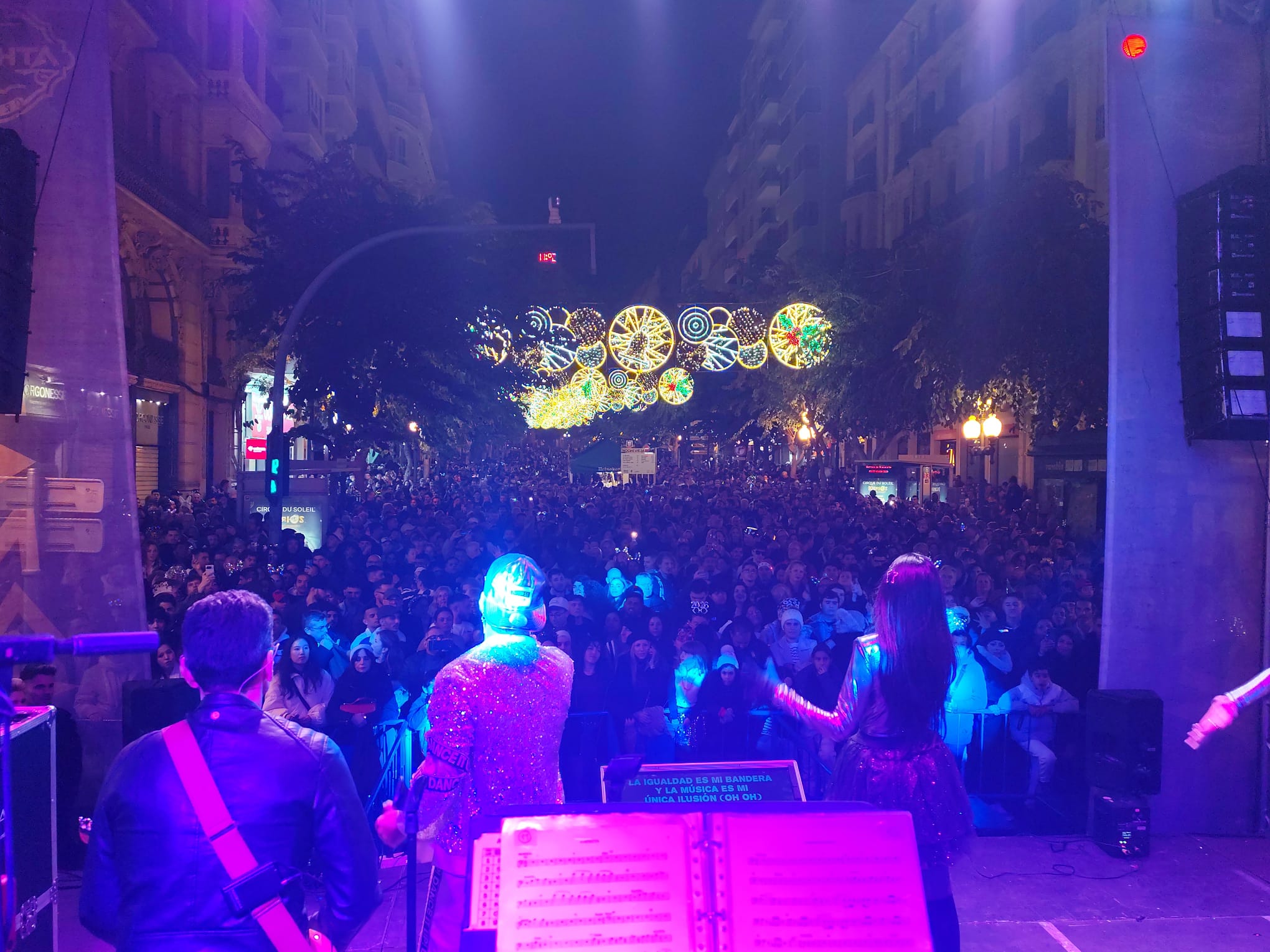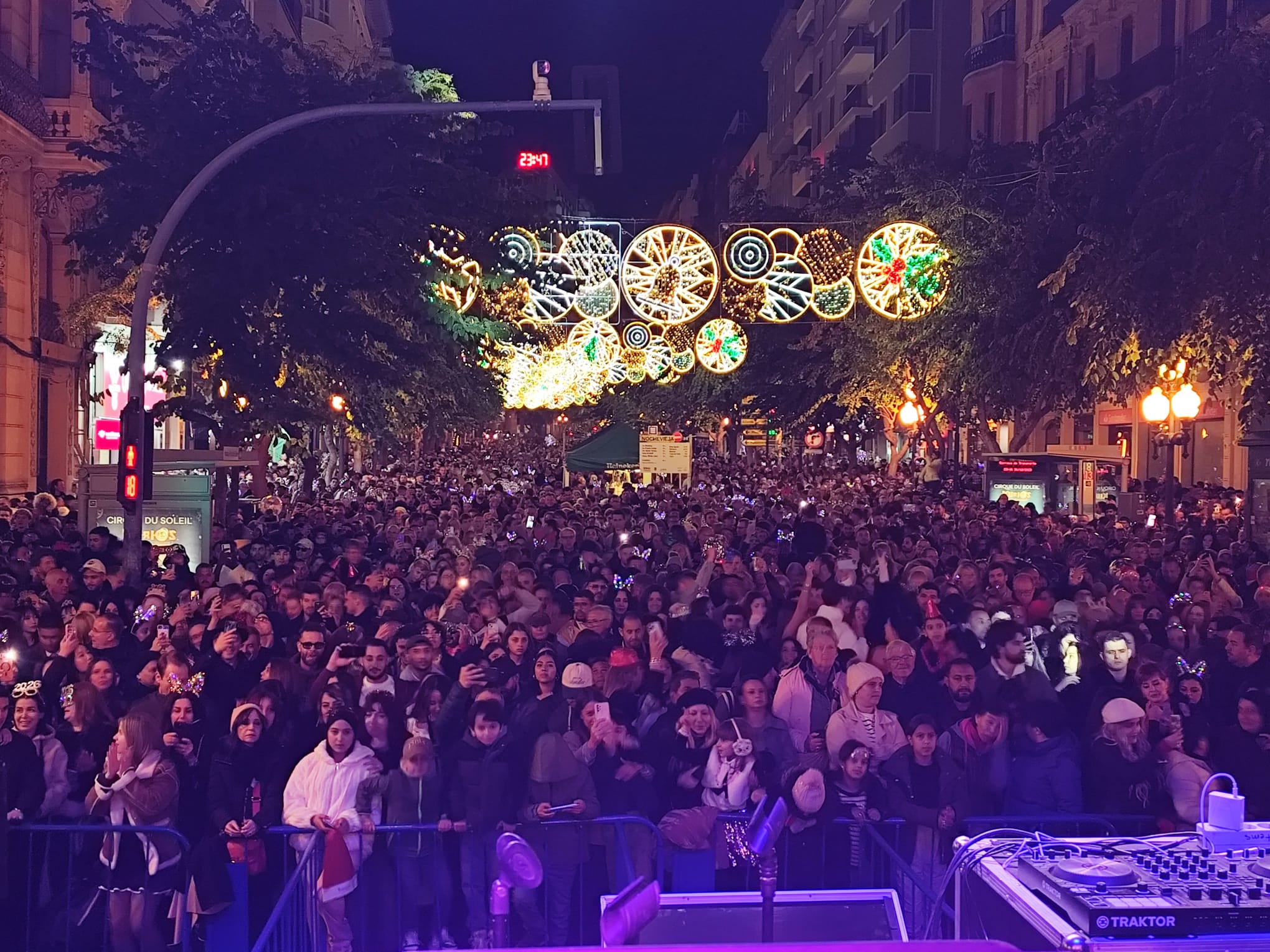 La Nochevieja 2025 ha comenzado a tomar forma, poco después de las 22:30 horas con el comienzo de las intervenciones de distintos DJ´S. Un animador se ha ido encargando de preparar el ambiente de cara a la medianoche. Según se iban acercando las doce ha comenzado también el reparto de más de 2.000 bolsas con uvas de la suerte, en una tradicional iniciativa liderada por Mercalicante.
