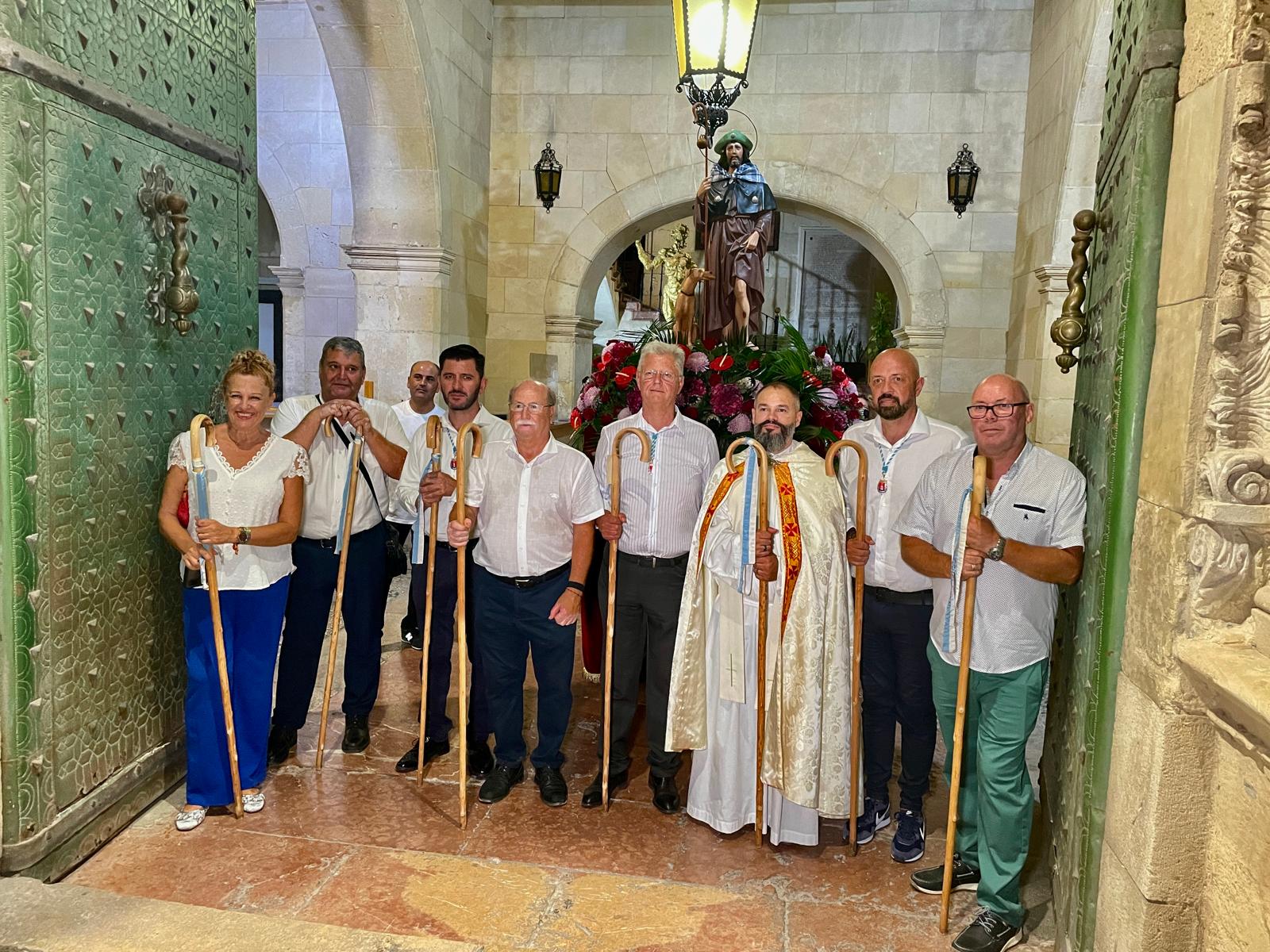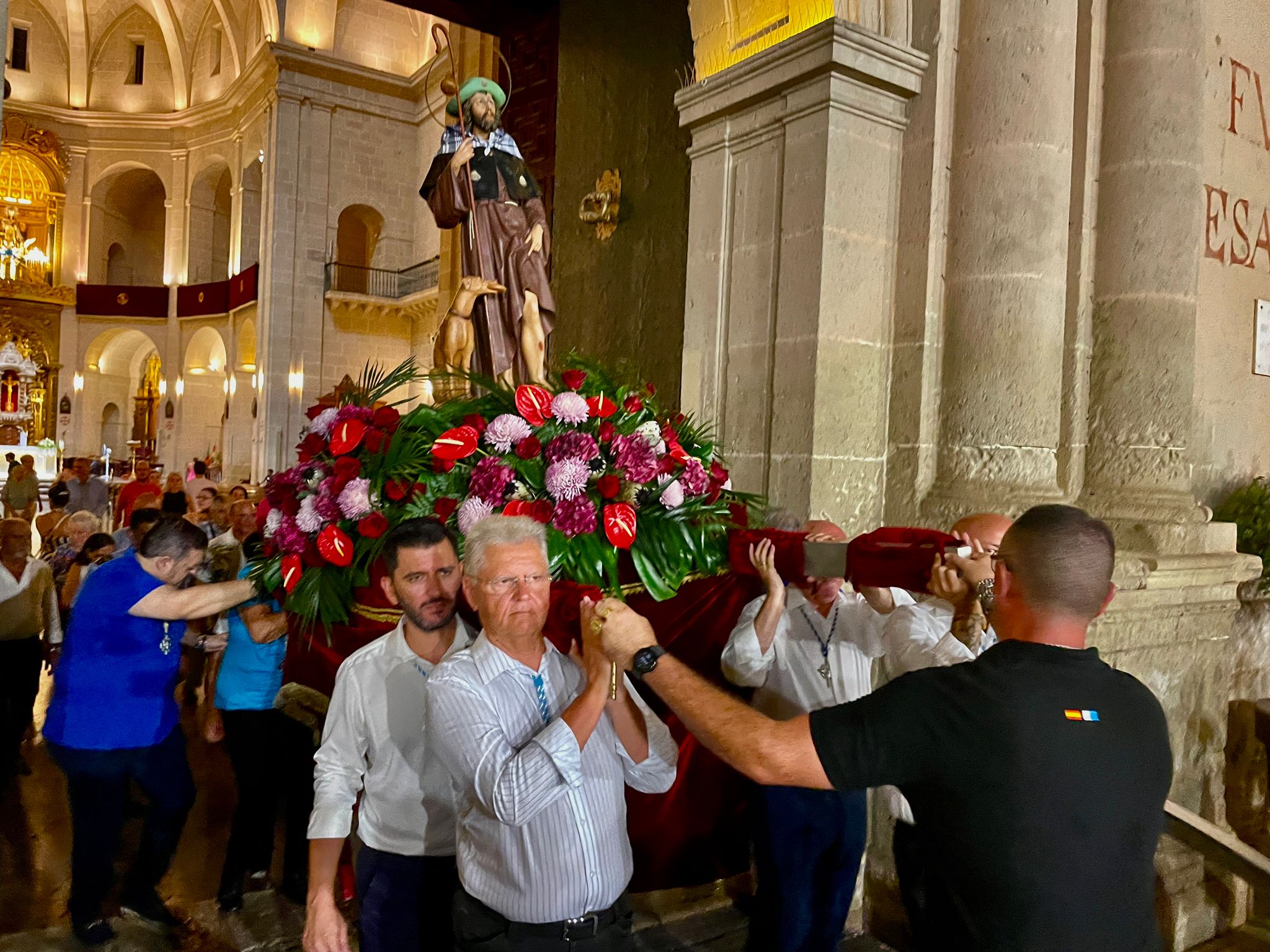 El Ayuntamiento de Alicante ha recibido este viernes a la imagen del copatrón, San Roque, en el zaguán de la Casa Consistorial. Lo ha hecho al paso de la procesión que ha partido desde la ermita del santo. La imagen ha sido saludada por el concejal-síndico, Julio Calero, quien ha destacado que «estas celebraciones, con un claro sabor a las raíces alicantinas, entroncan con una tradición de cinco siglos asentada en el Casco Antiguo».