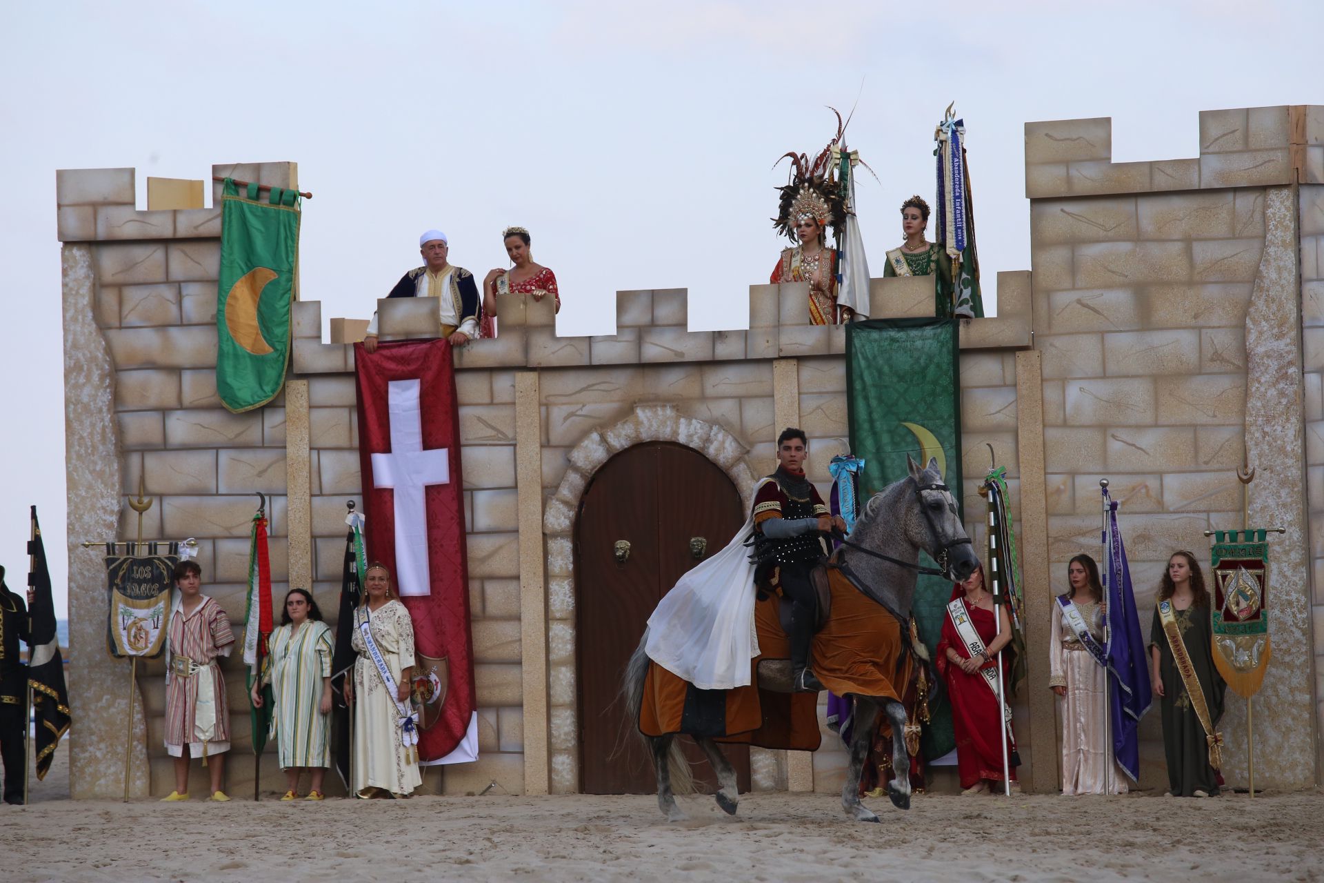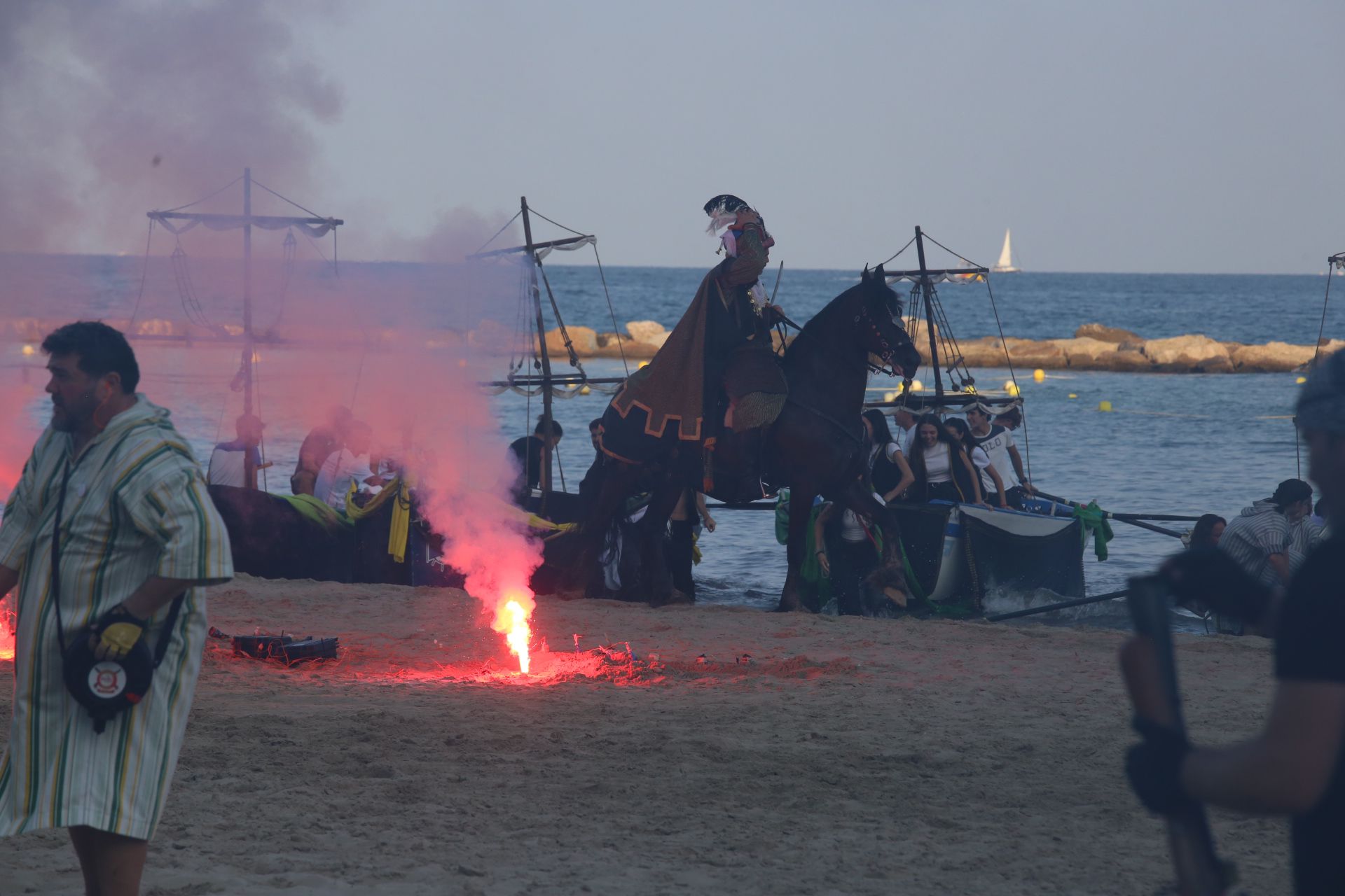 Cuatrocientes festeros, en total, han participado en el Desembarco. La ambientación previa la han puesto los integrantes del ballet de Griselda Comín y para dotar de más realismo a la escenificación han aparecido cuatro caballos, para los bandos moro y cristiano. Todo lo que ha ido ocurriendo lo ha contado un narrador, para que pudiera ser seguido por el público que se ha citado en el arenal y sus inmediaciones, como en el propio mar, en las tribunas instaladas en el Paseo de Gómiz, en el murete de la calle Virgen del Socorro o en la pasarela elevada de la avenida Juan Bautista Lafora.
