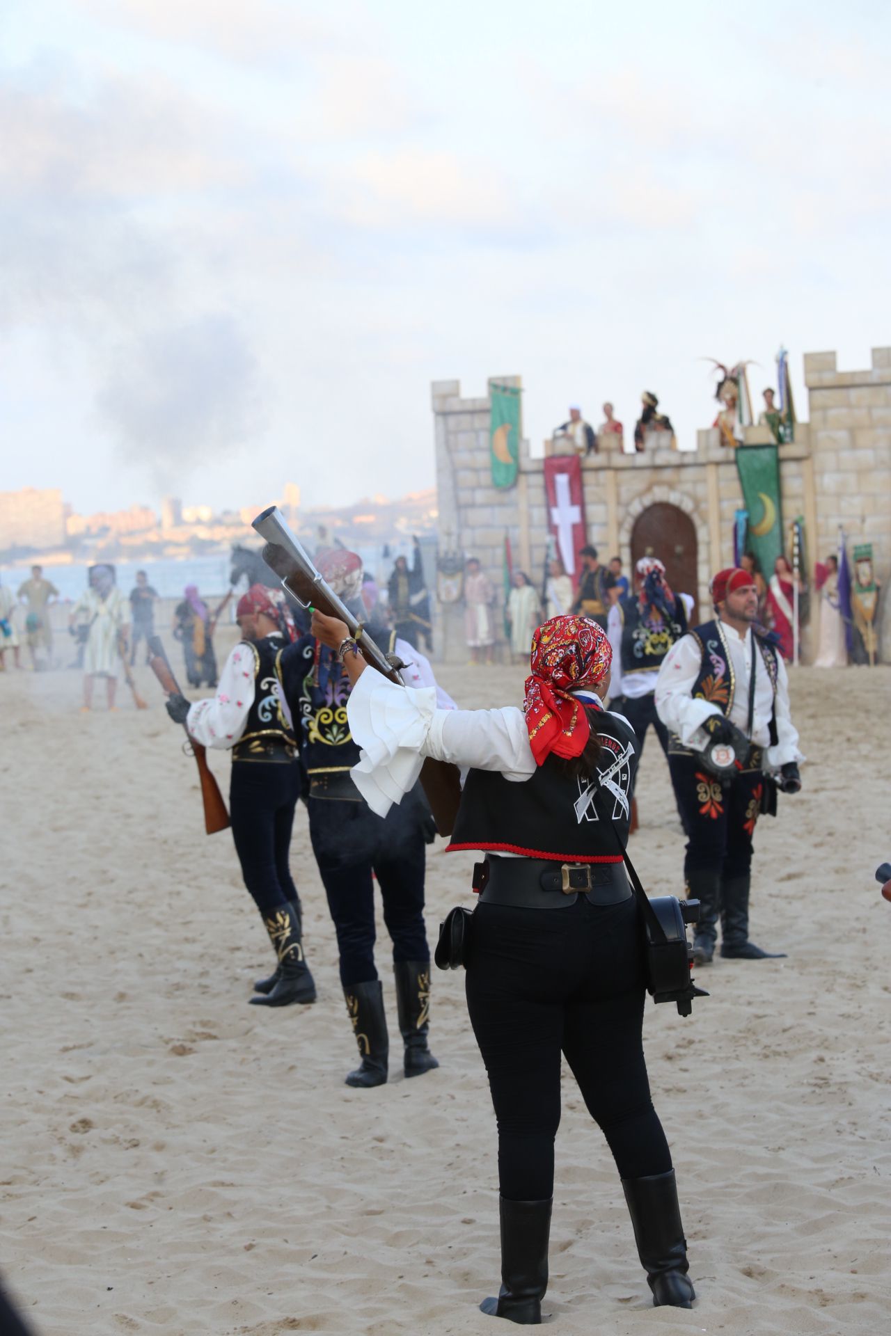 - Siete faluchos, con 56 festeros moros a bordo, llegan a la arena, donde fueron recibidos con disparos de arcabucería por un centenar de cristianos