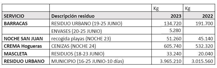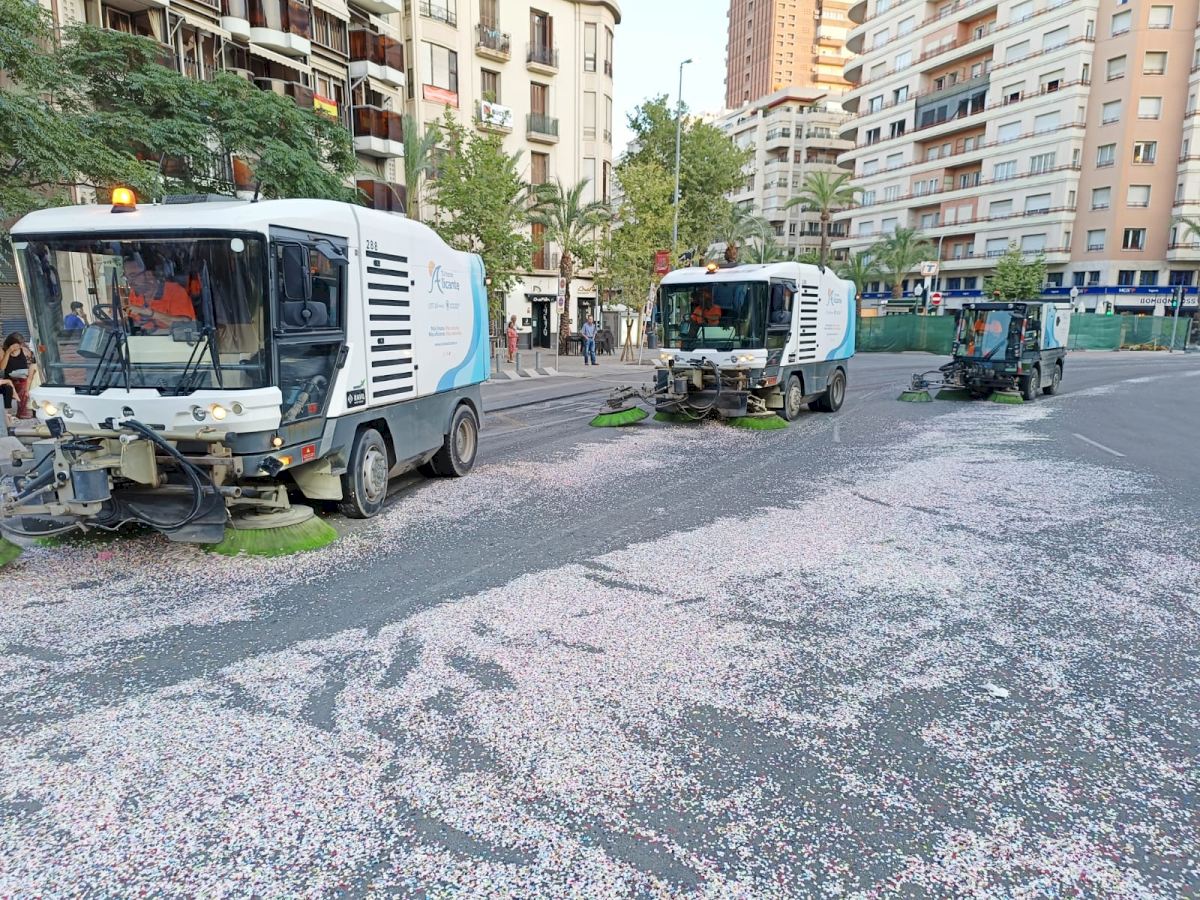 Alicante ha incrementado en mil toneladas los residuos recogidos en estas Hogueras de 2023 frente a las del pasado año. Así lo demuestra los datos facilitados por la empresa concesionaria del servicio de limpieza viaria y recogida de residuos, UTE Alicante, que arrojan un total de 4.795.450 kilogramos retirados de calles y plazas, frente a los 3.804.760 kilos registrados en 2022. El dispositivo especial de limpieza se mantendrá hasta el próximo día 30 de junio con refuerzo del barrido manual y del baldeo de calles y plazas, además de la actuación con hidrolimpiadoras, para que la ciudad vuelva al completo a la normalidad a lo largo de lo que resta de semana.