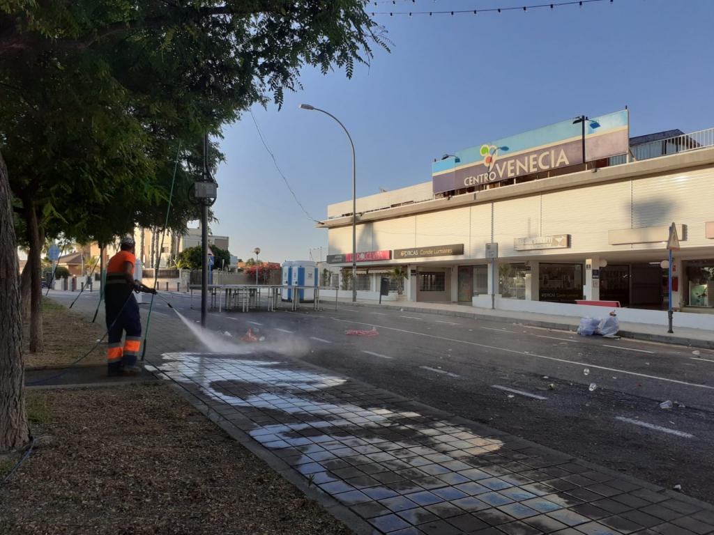 Los servicios de limpieza empiezan su trabajo a las cinco de la madrugada para que la ciudad preparada a primeras horas de la mañana. Además, también se mantiene operativo uno equipo de trabajo para repaso a partir del mediodía. Además, se refuerza el baldeo en todos los barrios desde entre los días 26 y el 30.