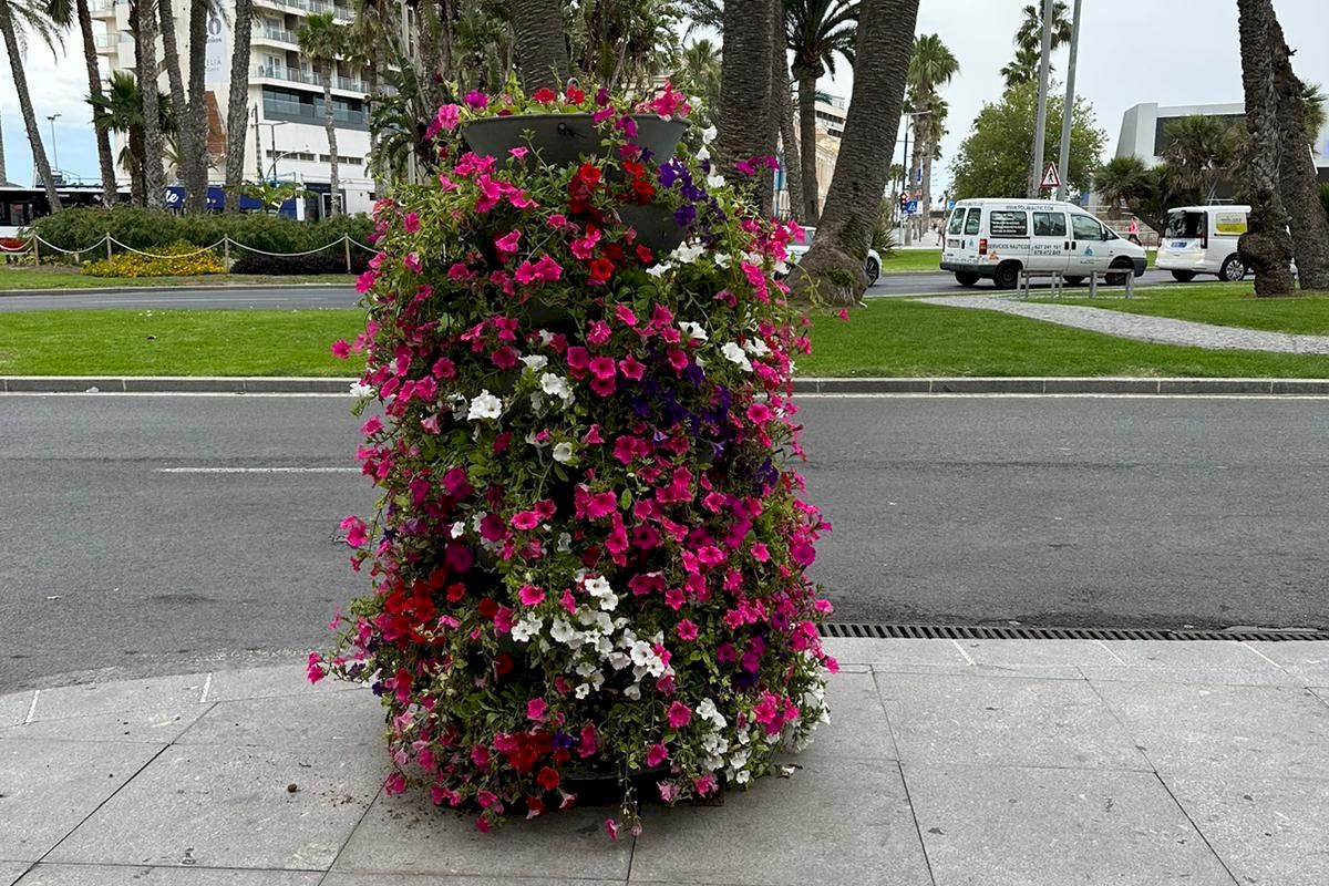Como ya hicieran el año pasado con la instalación de figuras florales gigantes de las bellezas del fuego o enmarcando los arcos principales del palacio consistorial, ya se pueden ver por la ciudad los nuevos conos florales con los que Alicante anuncia la llegada de sus fiestas del fuego y con ellas la llegada del verano. La Puerta del Mar, la plaza del Ayuntamiento, el entorno de la plaza de Calvo Sotelo y la avenida de Maisonnave o el Mercado Central son algunos de los lugares donde se han instalado estas nuevas columnas de flores que contribuyen al embellecimiento de la ciudad.