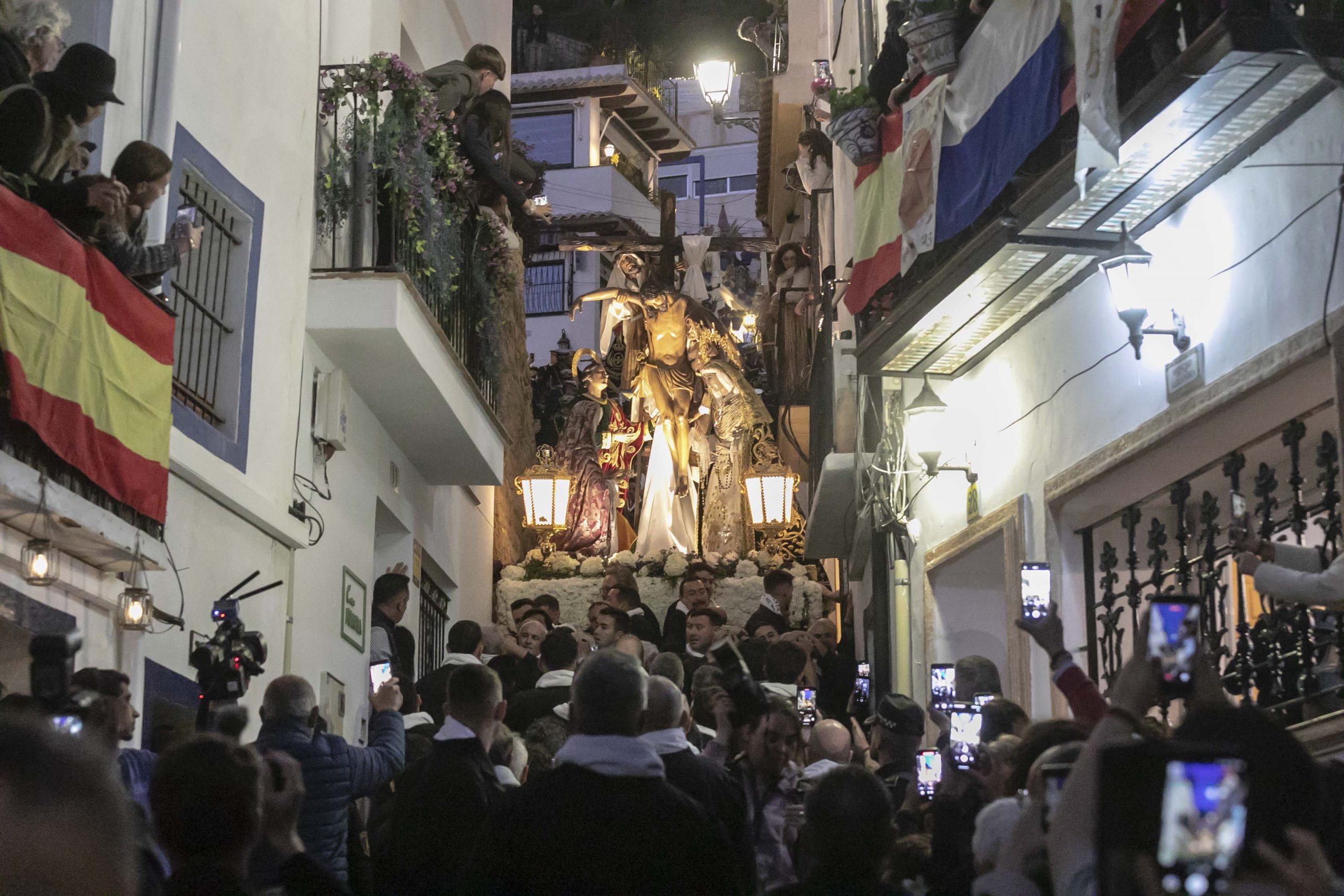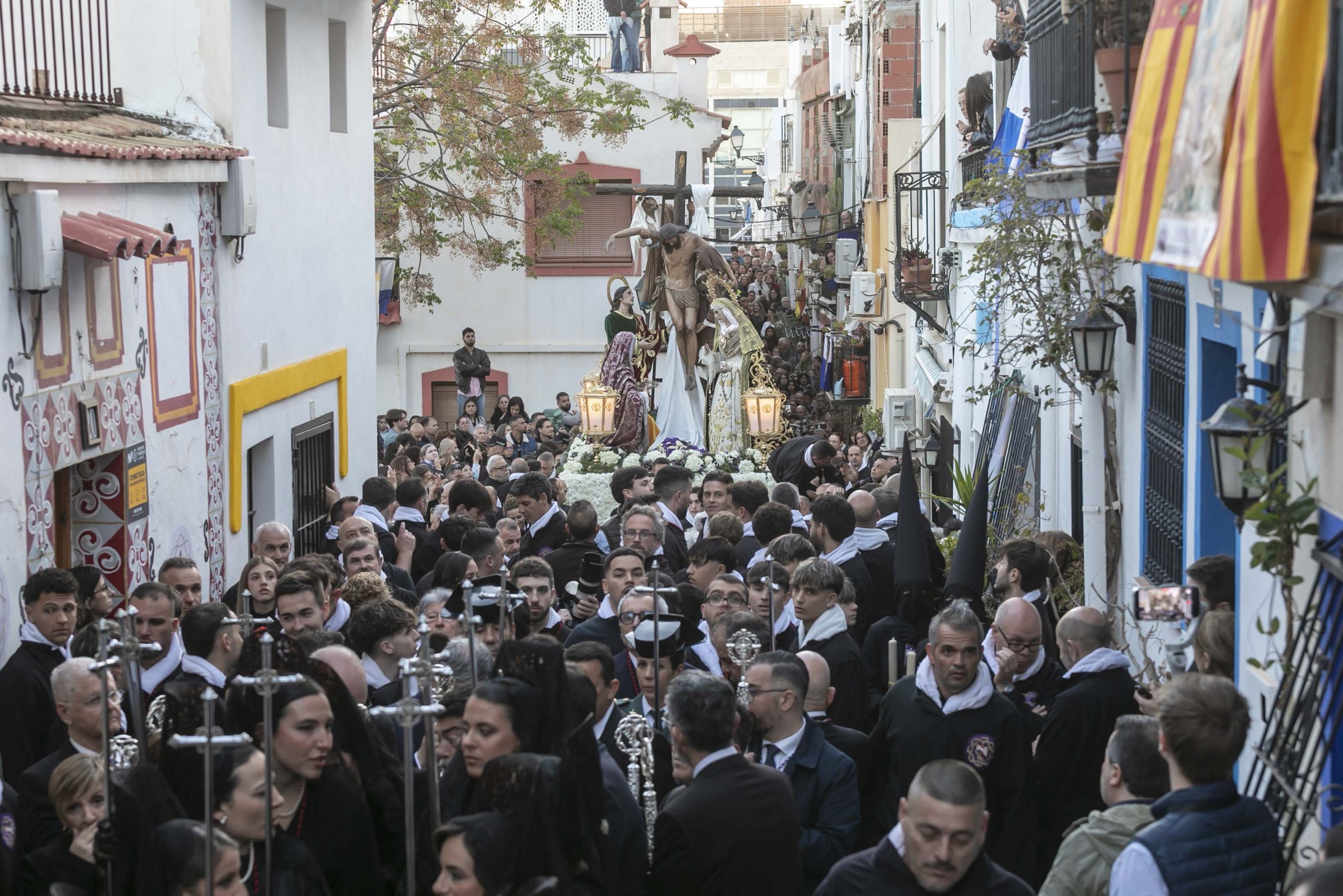 Alicante se ha revestido de fervor, devoción, esplendor y tradición este Miércoles Santo con la procesión de Santa Cruz que ha congregado a millares de personas en el Casco Antiguo, laderas del monte Benacantil y en la Carrera Oficial. La Cofradía del Cristo del Divino Amor y Virgen de la Soledad Coronada ‘La Marinera’ ha abierto las procesiones del cuarto día de la Semana Santa de Alicante con los nuevos pasos de Jesús Consolado y el Cristo de la Sangre. Luis Barcala, alcalde de Alicante, y el presidente de la Generalitat Valenciana, Juan Francisco Pérez Llorca, han presidido la procesión de Santa Cruz con el paso del Descendimiento. La comitiva ha partido desde la Plaza de la Ermita después de un minuto de silencio en memoria de los hermanos fallecidos.