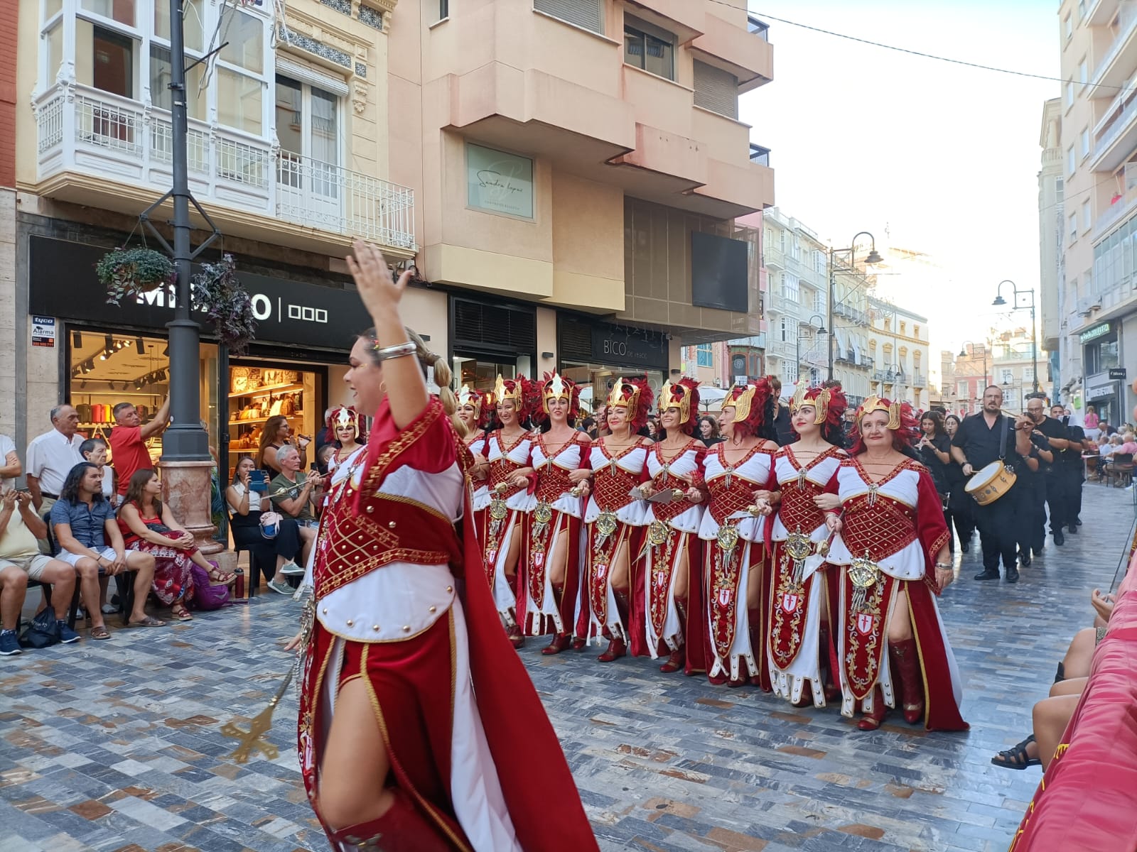 - Las concejalas Cristina Cutanda y Cristina García presencian el desfile en Cartagena junto a los festeros y dos bandas de música
