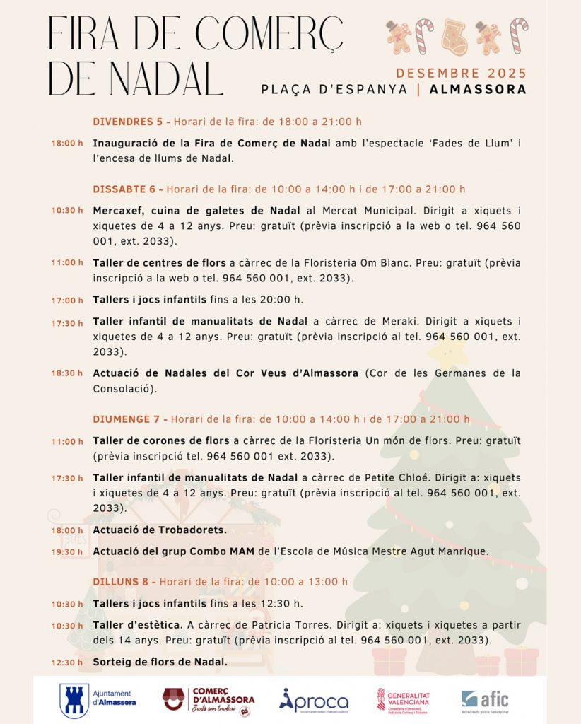 “La programació que hem preparat per als dies 5, 6, 7 i 8 de desembre està pensada perquè tota la família puga gaudir, des de tallers creatius fins a actuacions musicals, sense oblidar el tradicional encés de llums, que cada any plena d’il·lusió a xicotets i majors. Volem que esta fira siga un punt de trobada, un espai on descobrir l’àmplia oferta comercial d’Almassora i, al mateix temps, gaudir de l’ambient nadalenc”, ha destacat la regidora de Comerç.