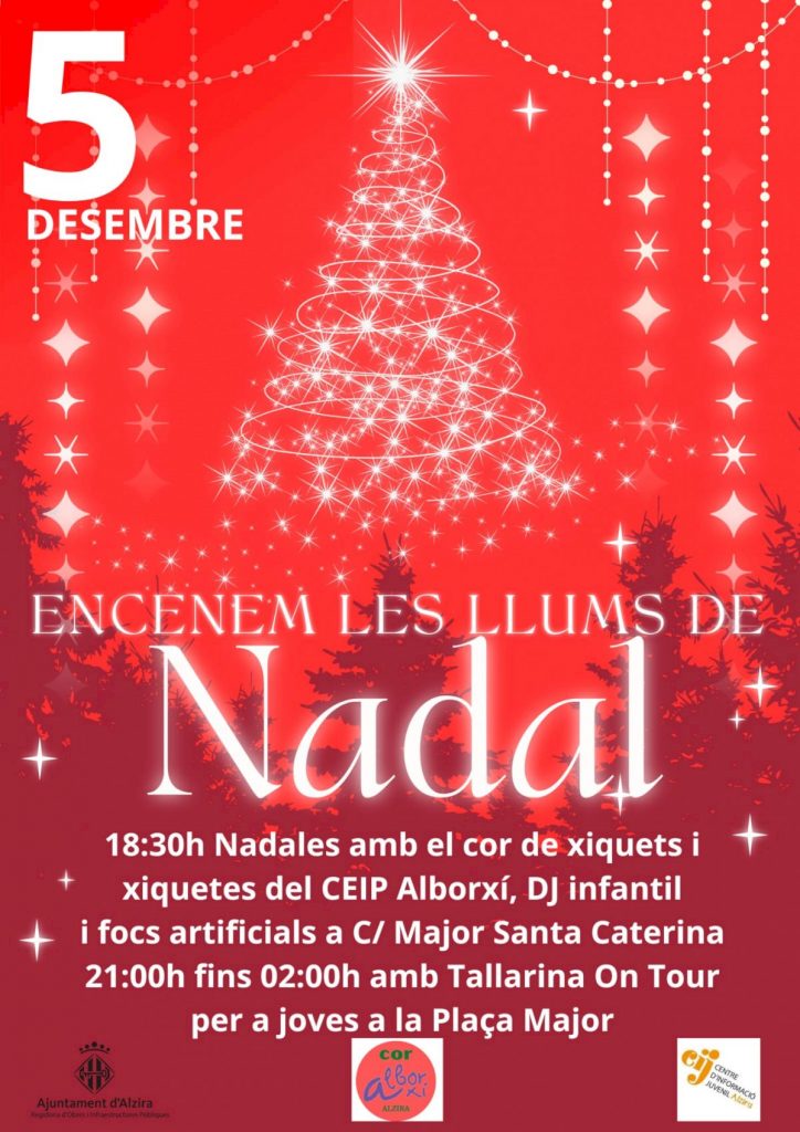 La vesprada començarà amb l’actuació del cor de xiquets i xiquetes del col·legi Alborxí a les 18:30 hores, enfront de l’antic cine Colón. En acabar, hi haurà un compte arrere en una pantalla de led que acabarà amb la tradicional encesa de les llums de Nadal. La vesprada es completa amb diverses activitats com l’animació per part d’un personatge infantil, la selecció musical d’un DJ i un castell de focs d’artifici.