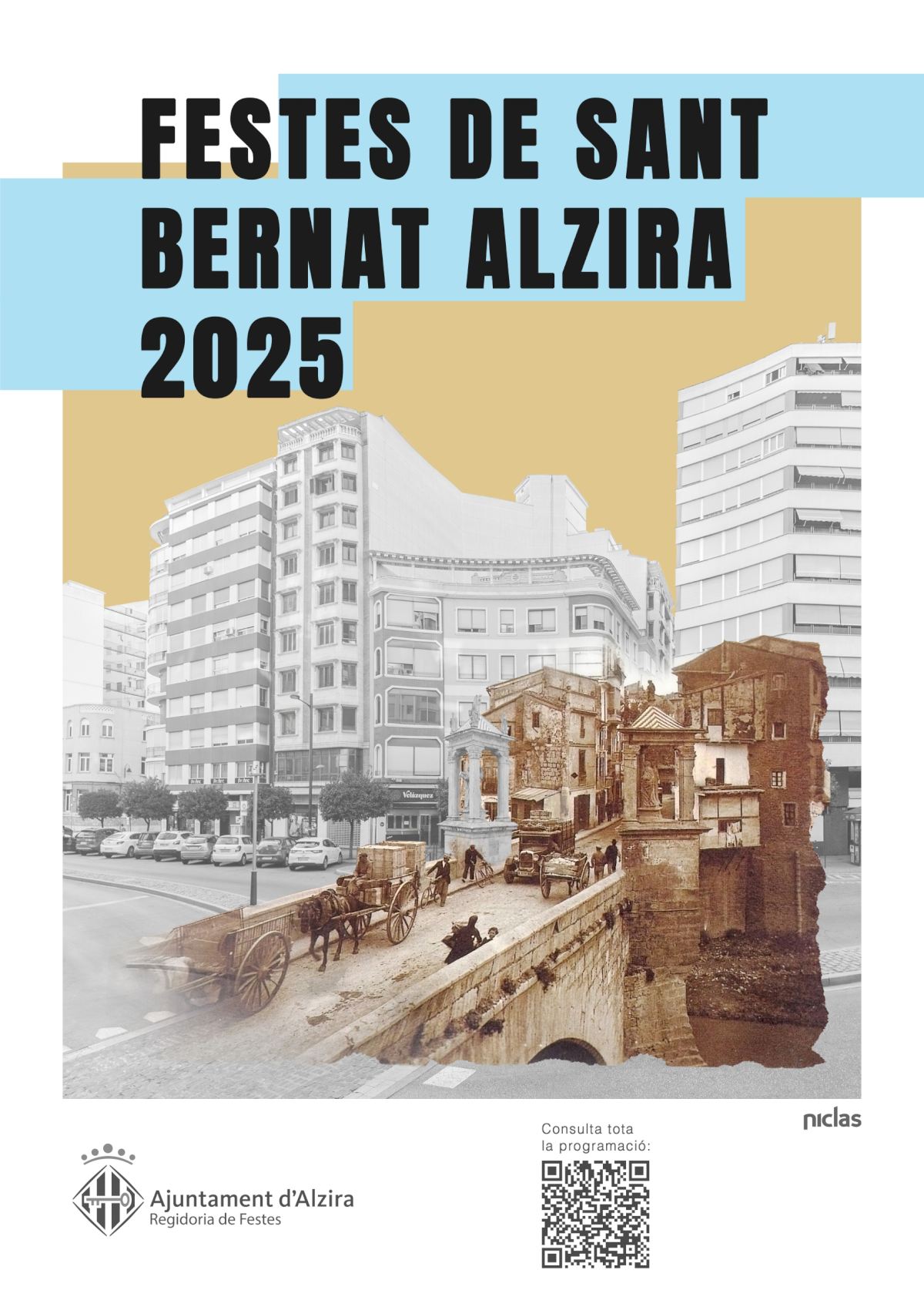 La Regidoria de Festes de l’Ajuntament d’Alzira ha presentat el cartell oficial de les Festes de Sant Bernat 2025, una composició visual que combina una fotografia antiga procedent de l’Arxiu Municipal del pont de Sant Bernat amb els casalicis, i una imatge actual del mateix emplaçament, integrat en l’avinguda principal de la ciutat. Esta creació és fruit d’una col·laboració entre l’Ajuntament i el fotògraf Niclas, qui ha sabut captar l’essència urbana i emocional i ha mostrat com este espai emblemàtic ha evolucionat, però conserva la seua importància simbòlica dins del paisatge alzireny.