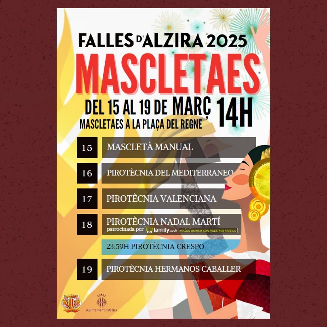 - 15 de març: Mascletà manual a càrrec dels membres de la Delegació de Pirotècnia de la Junta Local Fallera d’Alzira i dels delegats de pirotècnia de les diferents comissions.
