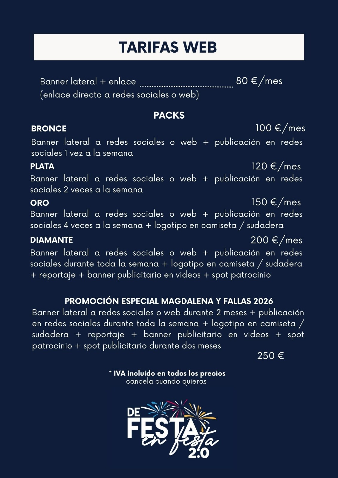 Desde el departamento de publicidad de De festa en festa 2.0 se ha preparado unas tarifas especiales para publicitar su negocio en web y redes sociales o en las emisiones especiales de Fallas, Magdalena y Hogueras de este portal web.