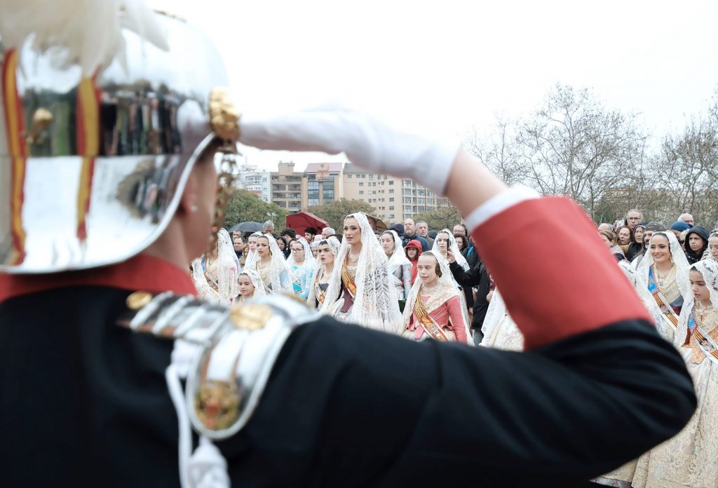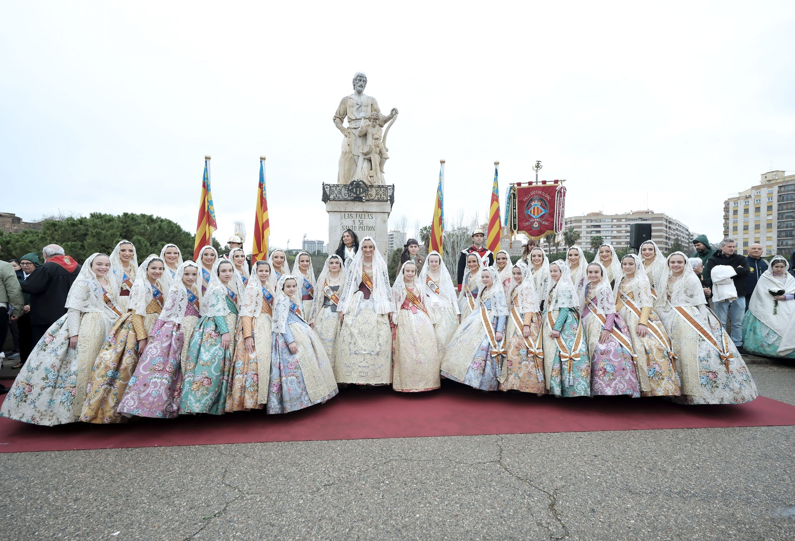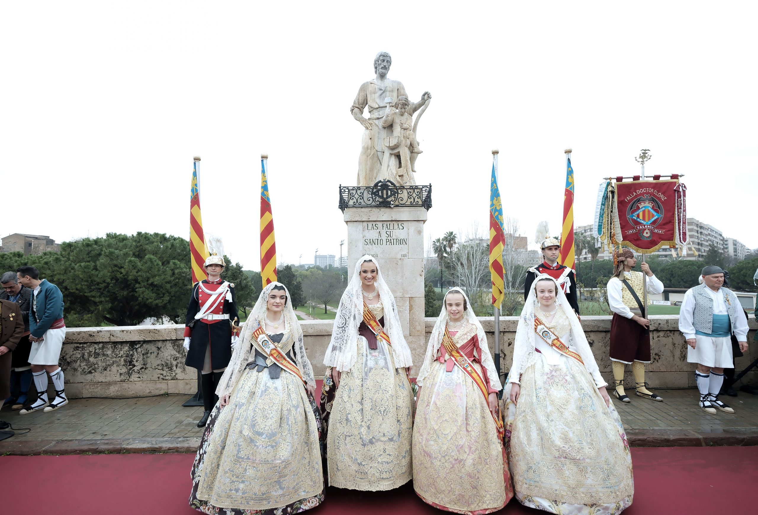 Antes de participar en la misa solemne en la Catedral, las Falleras Mayores de Valencia y sus Cortes de Honor han realizado una ofrenda de flores ante la imagen de San José, ubicada en el Puente de San José de Valencia.